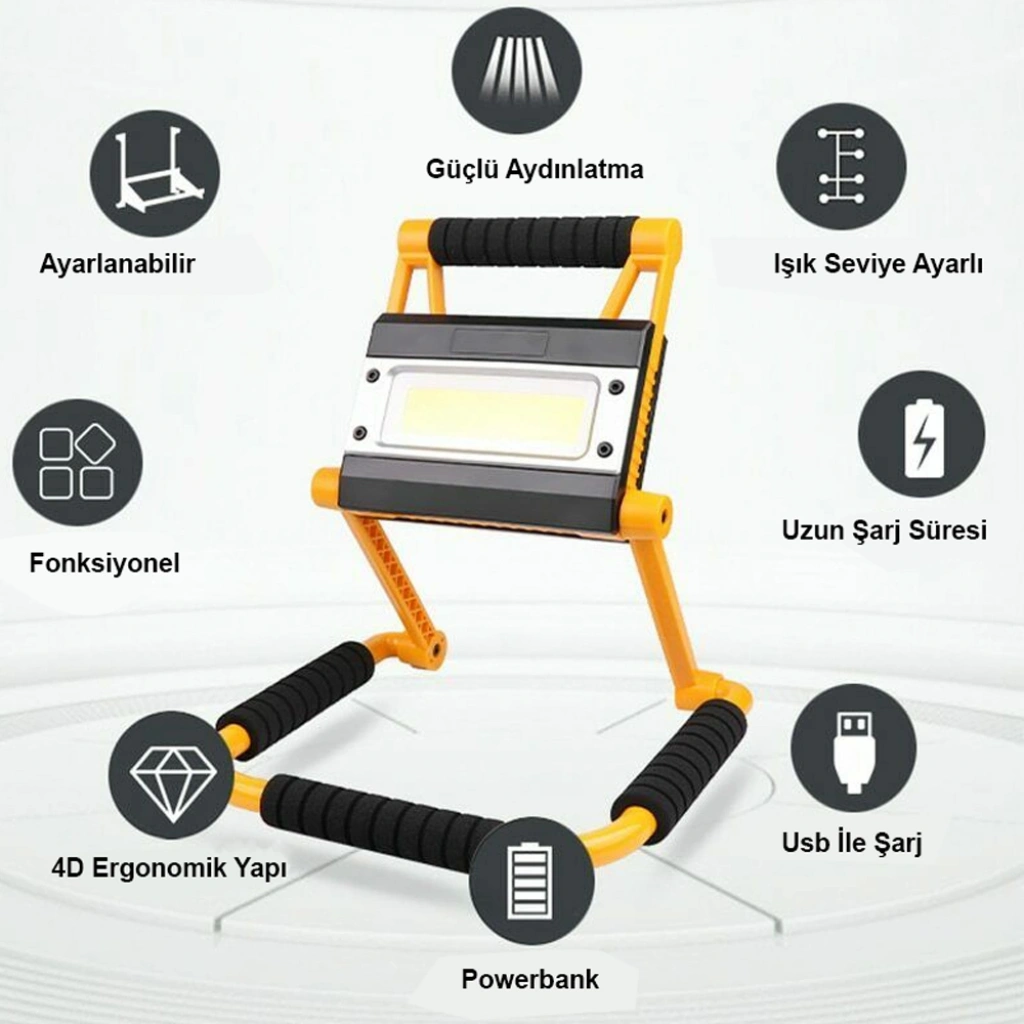 Özellikler: Tür: LED Sel lamba Malzeme: Sert Plastik TPR ( ağır darbelere dalı ) Miktar: 1 adet Ürün Rengi: Sarı LED Türü: COB 20W LED LED Adet: 1 Işık Renk: Beyaz Lümen: 1300LM Renk Sıcaklığı: 6000-6500K Işık Modu: Yüksek - Düşük - SOS Kiriş Açısı: 120 derece Şarj Süresi: 5 Saat Çalışma Süresi: 3 Saat - 5 Saat - Sellektör Modu 15 Saat Güç: 20W Giriş: DC 5V 1A Dönüş Açısı: 360 ° Yağmur Suyu Geçirmez: IP65 Aydınlatma Mesafesi: Maks. 100m / 328ft Yuva: 1 * USB yuvası, 1 * Mikro USB yuvası Anahtar: Evet Kullanım Süresi: 50.000 saatten fazla Pil Kapasitesi: 2 * 18650 lityum şarj edilebilir pil+ 4* (AA ) Ürün Boyutu: 24 * 22 *36 cm Paket: 1 * LED Taşkın Işık 1 * Şarj Kablosu 1 * Paket Kutu 2 * 18650 Lityum Pil