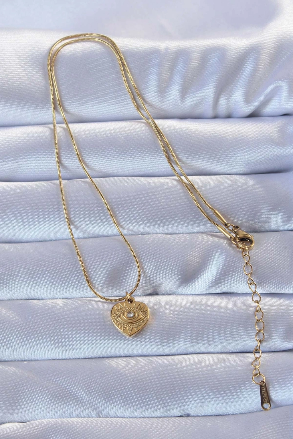 316L Altın Renk Zirkon Taşlı İşlemeli Göz Detay Kalp Kolye