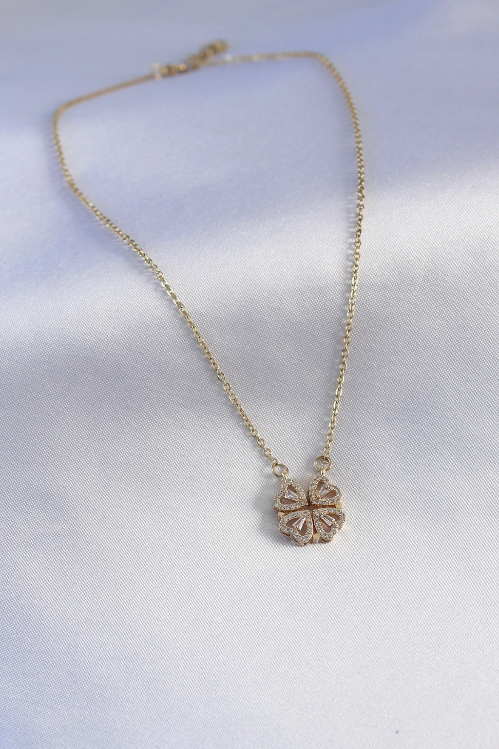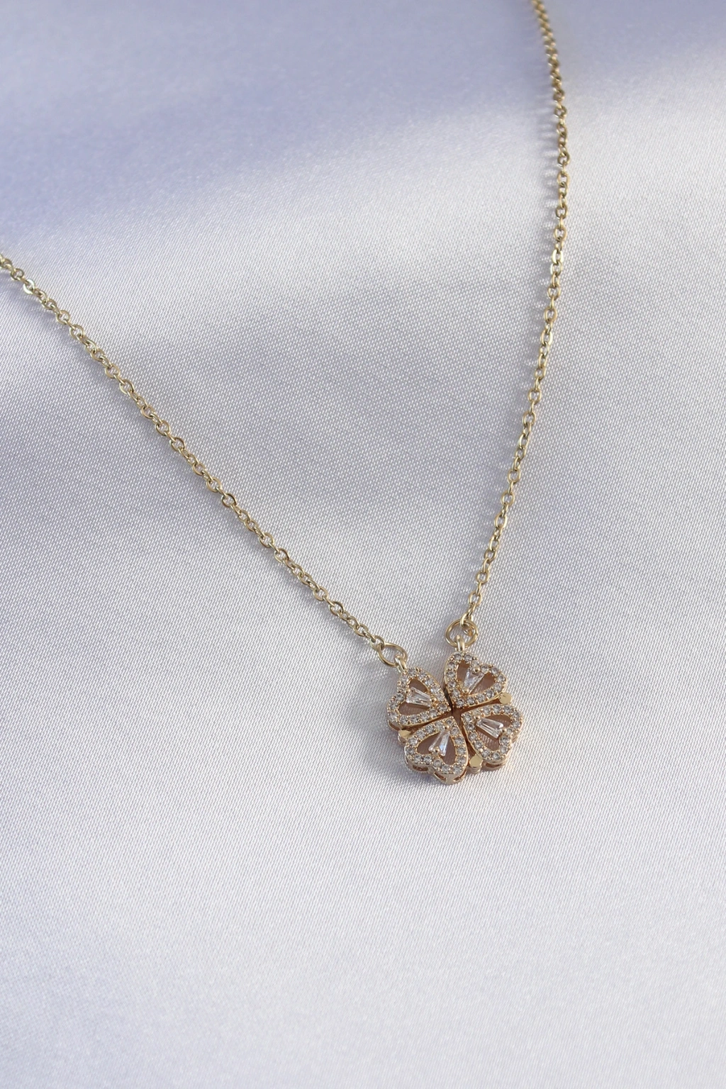 316L Çelik Gold Renk Açılır Zirkon Taşlı Yonca Model Kadın Kolye