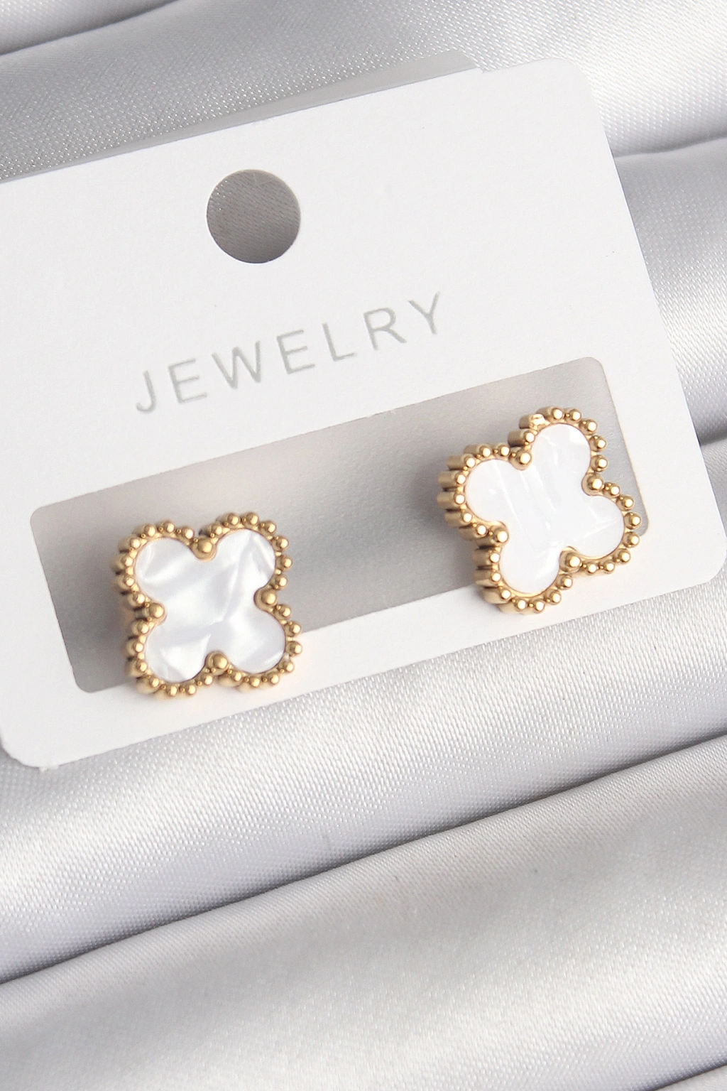 316L Çelik Gold Renk Beyaz Minelik Yonca Model Kadın Küpe