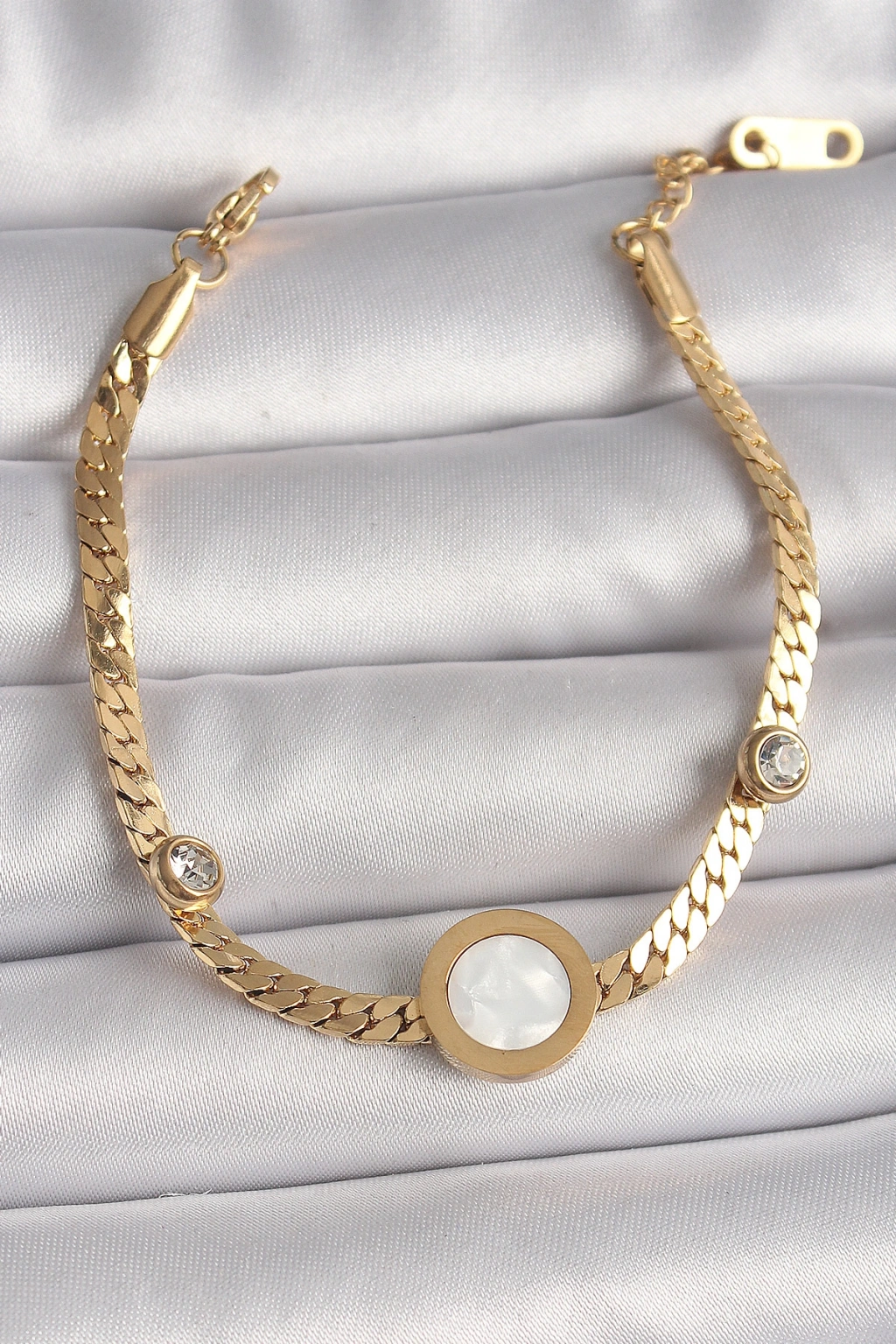 316L Çelik Gold Renk Yassı Zincir Model Zirkon Taş Detaylı Beyaz Mineli Madalyon Model Kadın Bileklik