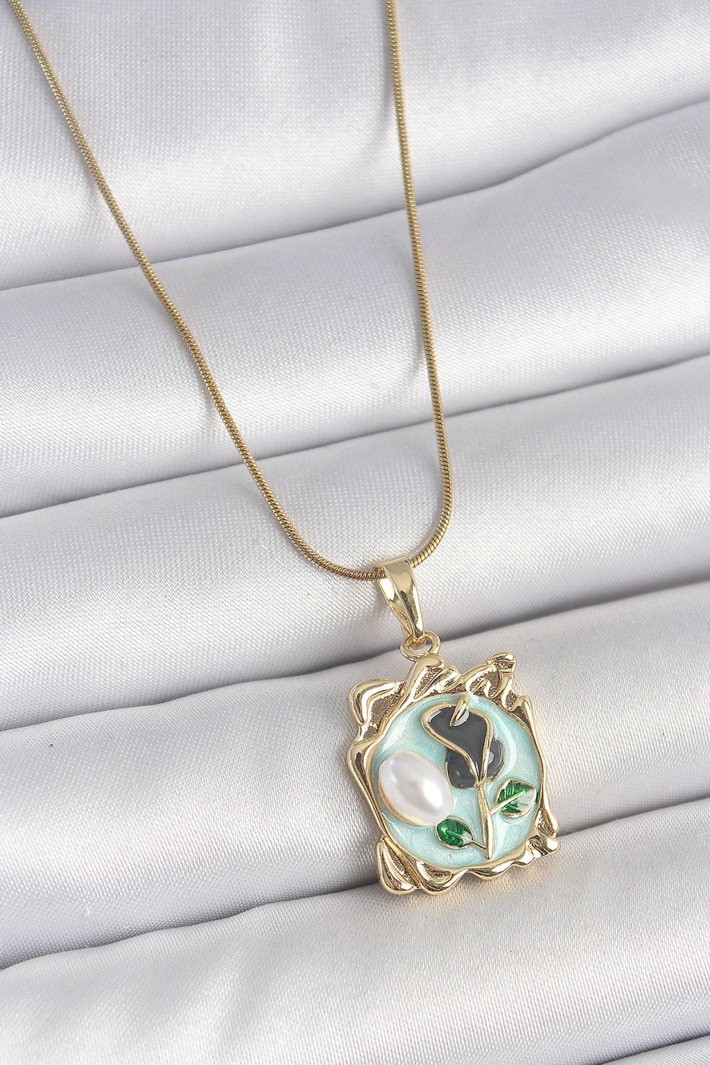 316L Çelik Gold Renk Zincir Mavi Mineli Çiçek İşlemeli İnci Detay Portre Model Kadın Kolye