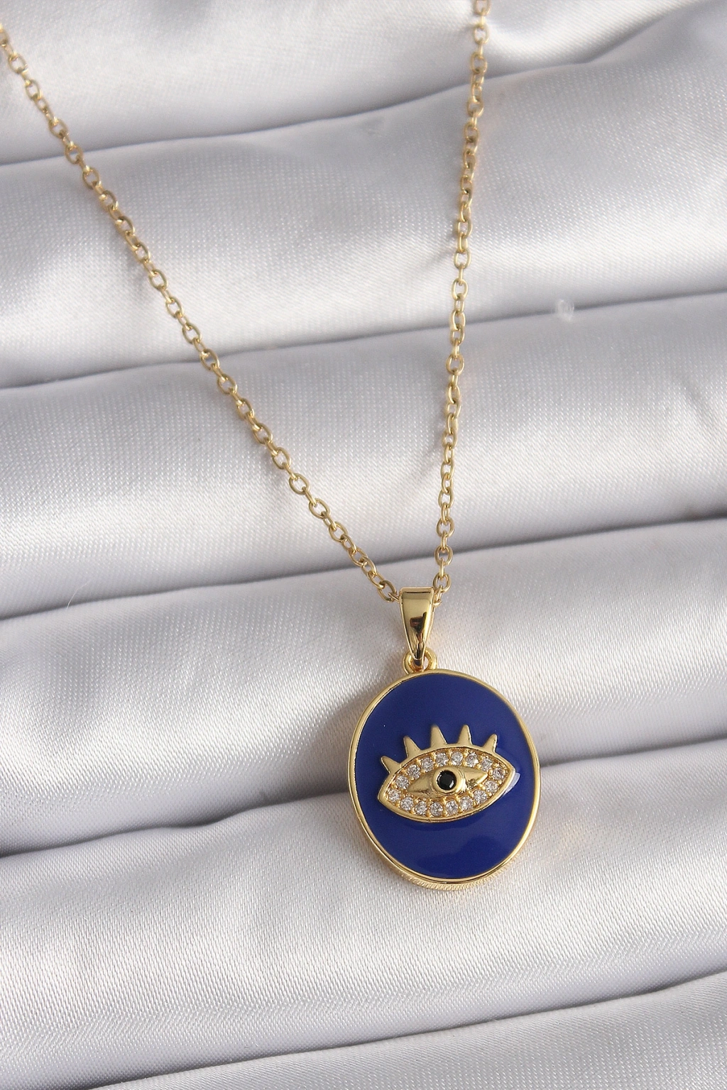 316L Çelik Gold Renk Zincir Mavi Mineli Zirkon Taşlı Göz İşleme Kadın Kolye