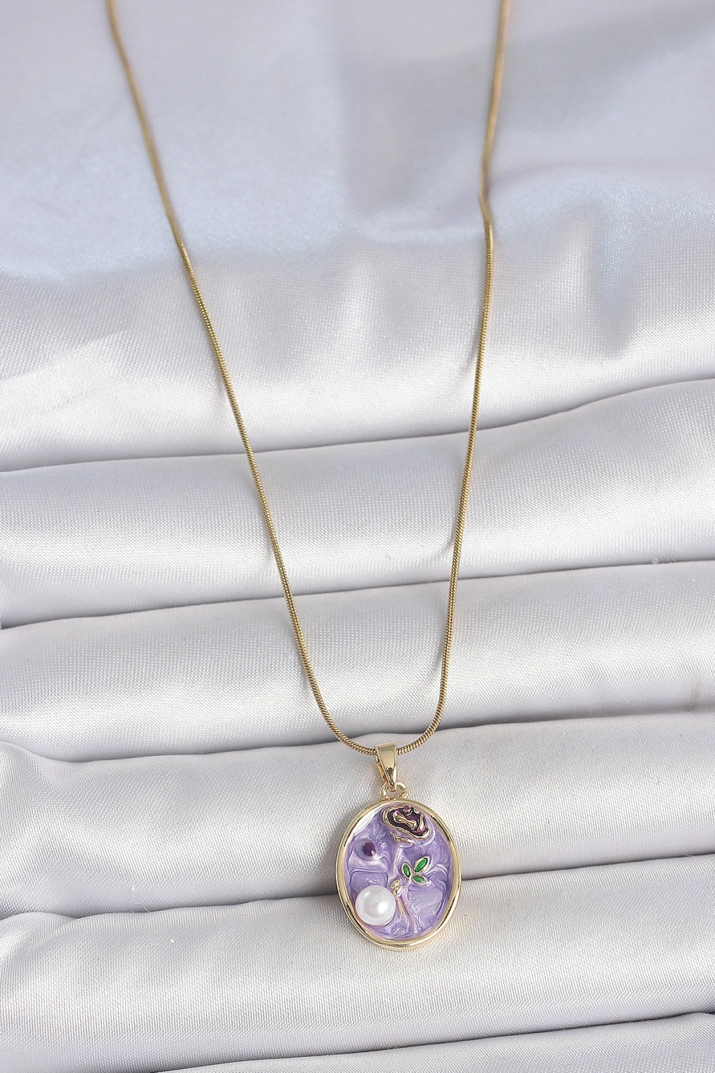 316L Çelik Gold Renk Zincir Mor Çiçek İşlemeli İnci Detay Portre Model Kadın Kolye