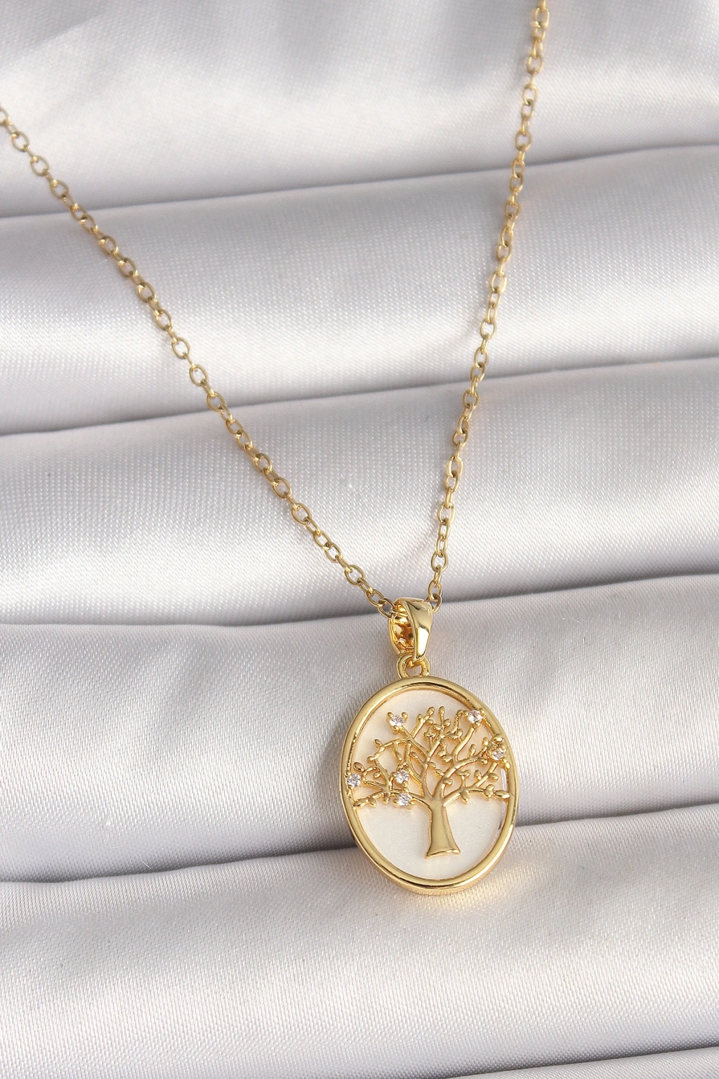 316L Çelik Gold Renk Zincir Zirkon Taş Detaylı Beyaz Mineli Ağaç İşlemeli Portre Model Kadın Kolye