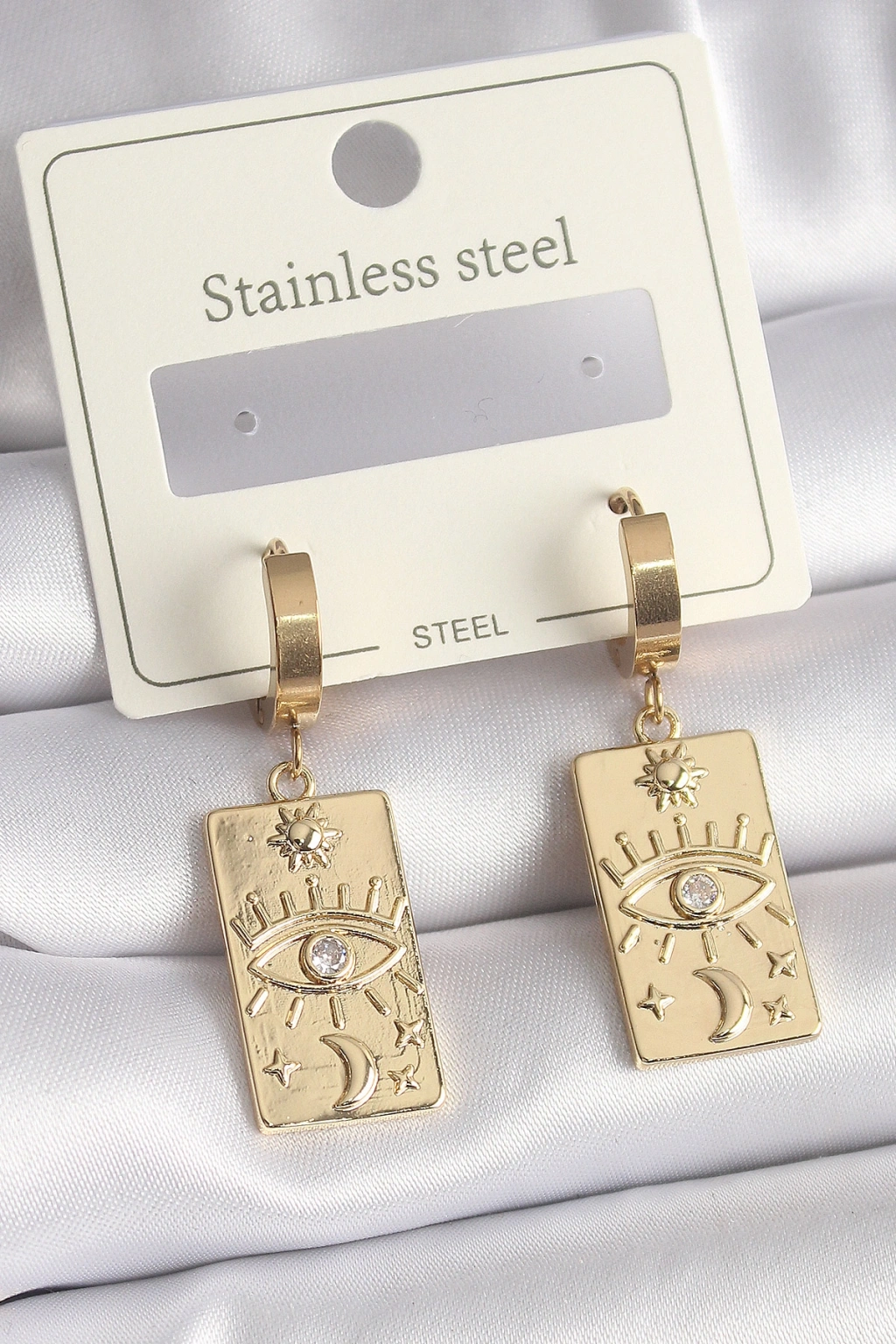 316L Çelik Gold Renk Zirkon Taşlı Göz İşleme Detay Plaka Model Kadın Küpe