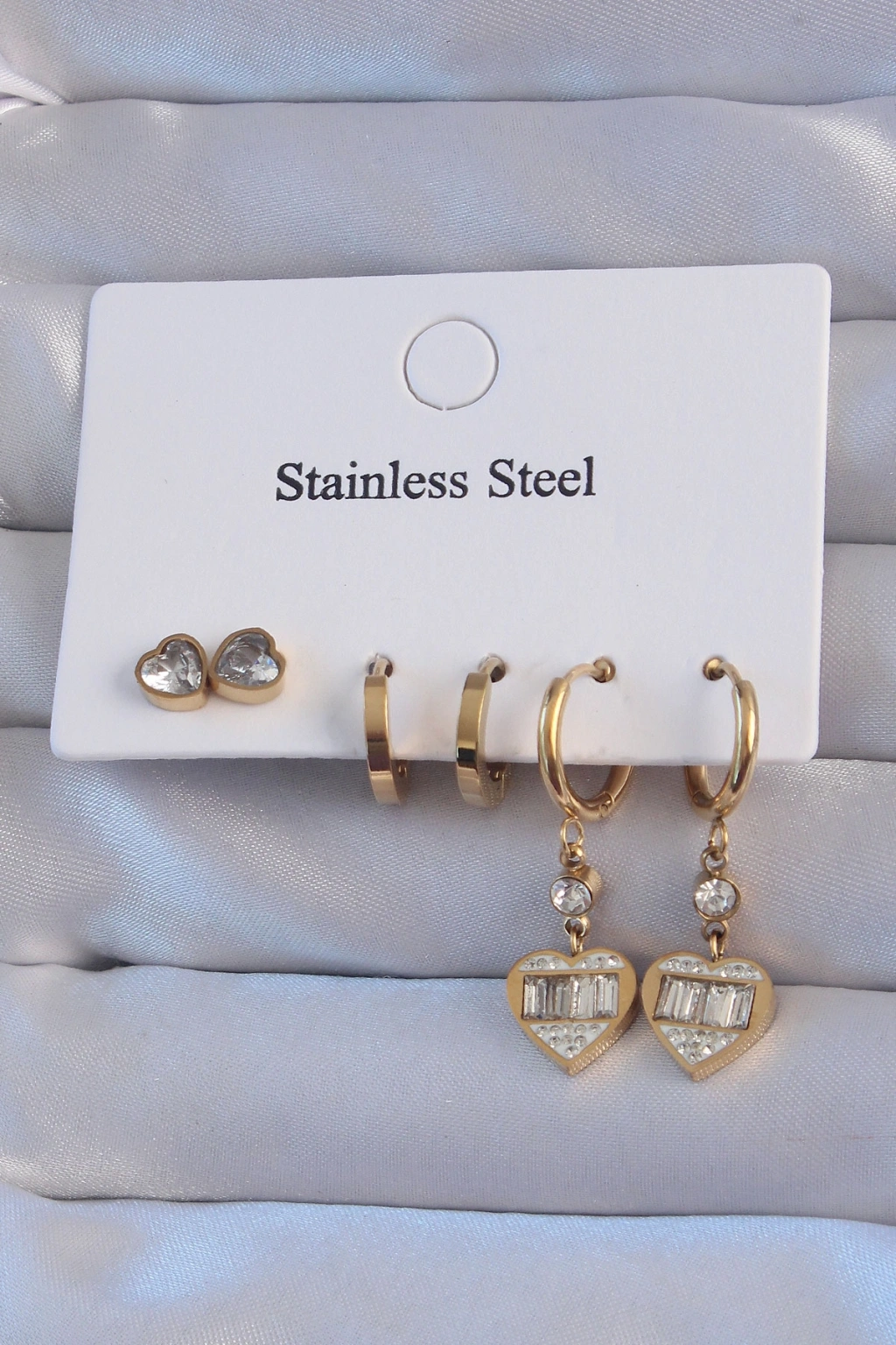 316L Çelik Gold Renk Zirkon Taşlı Kalp Model Halka Küpe Seti