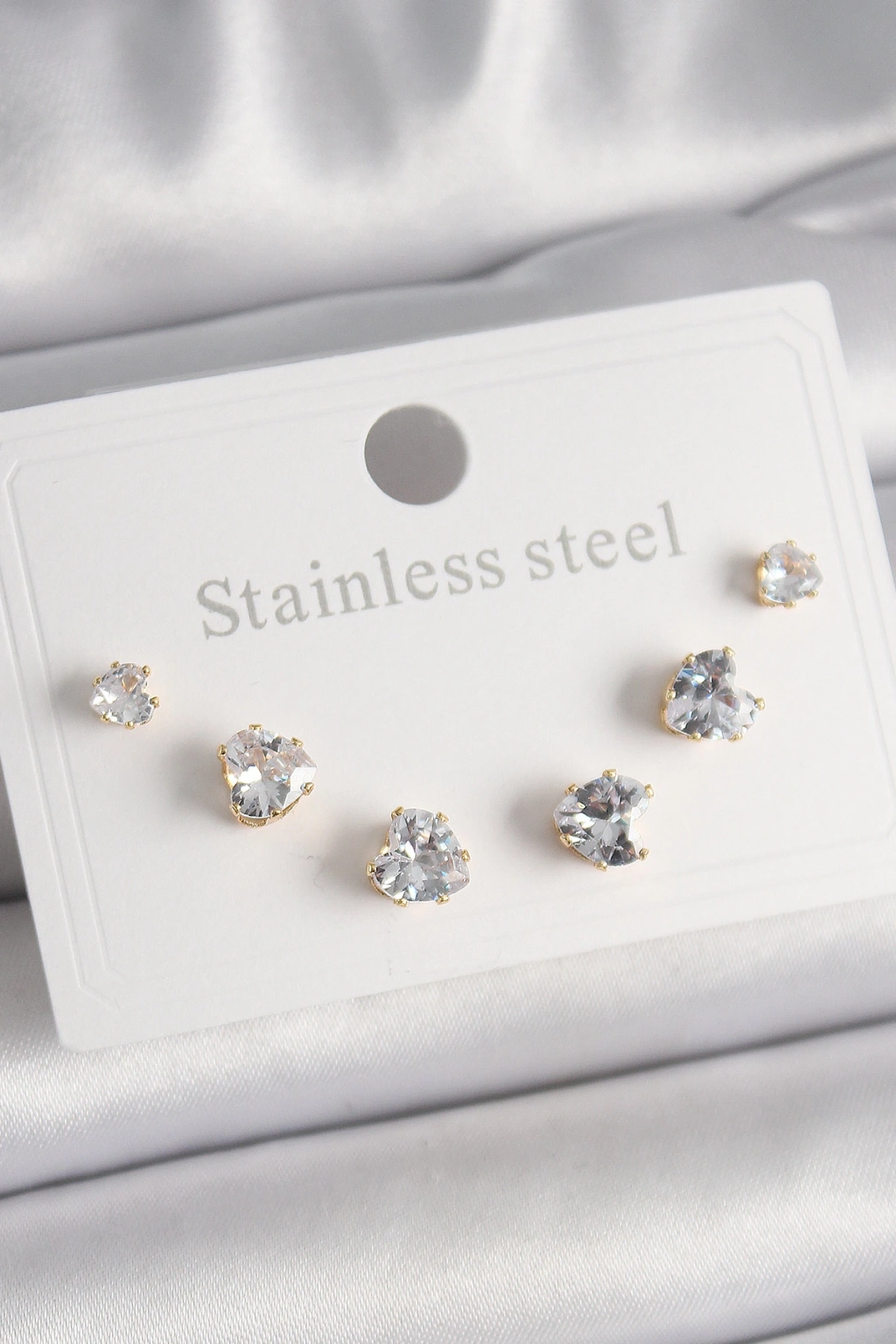 316L Çelik Gold Renk Zirkon Taşlı Kalp Model Kadın Küpe Seti