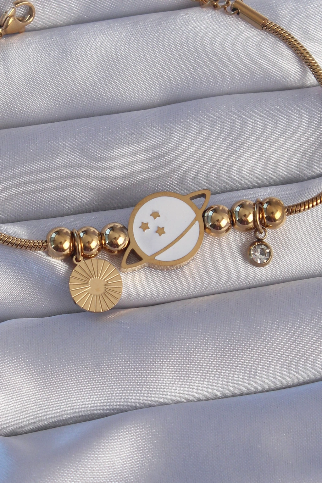 316L Çelik Gold Renk Zirkon Taşlı Mineli Satürn Tasarımlı Bileklik