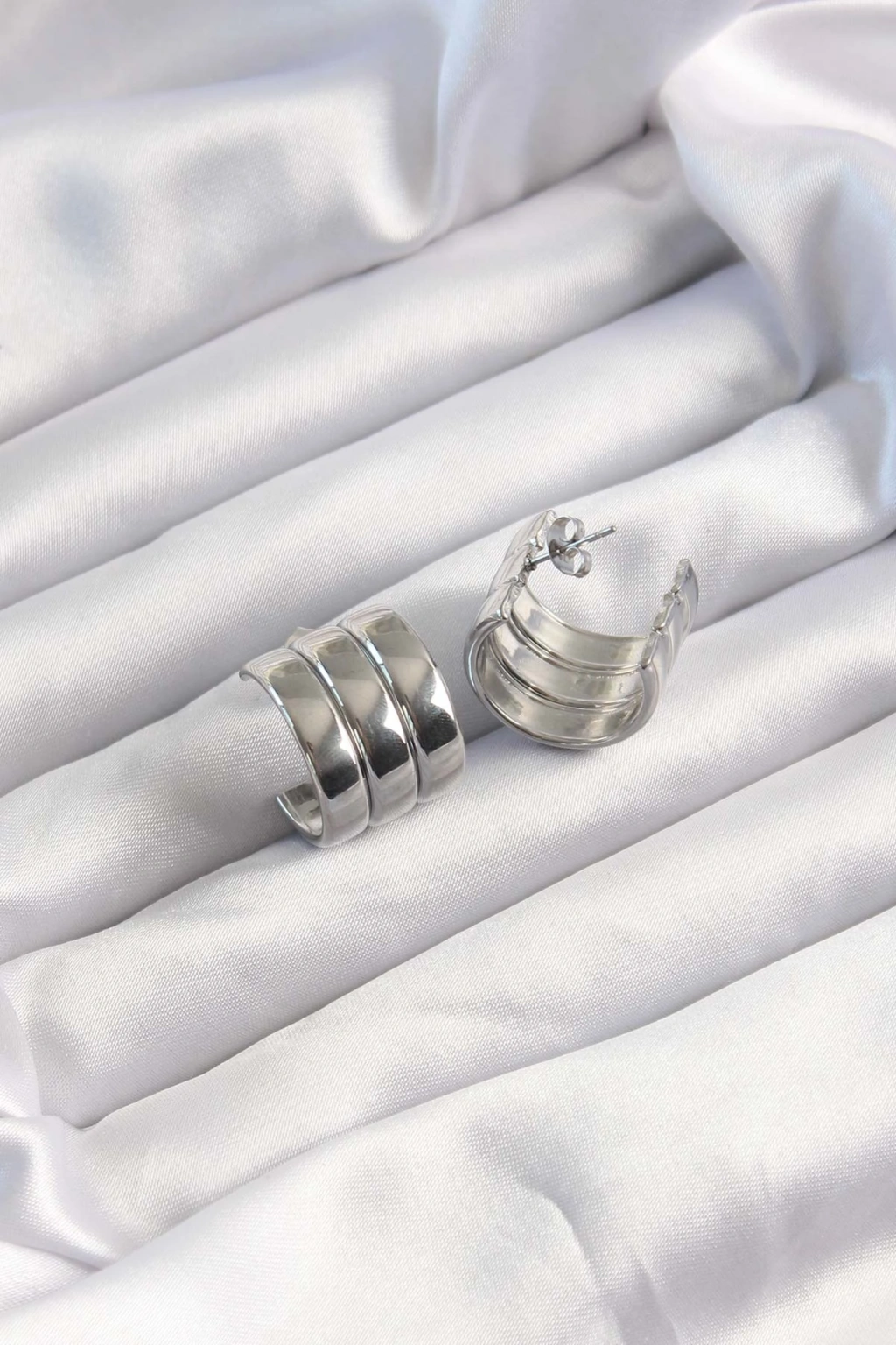316L Çelik Gümüş Renk 3lü Görünüm Bombe Model Yarım Halka Küpe