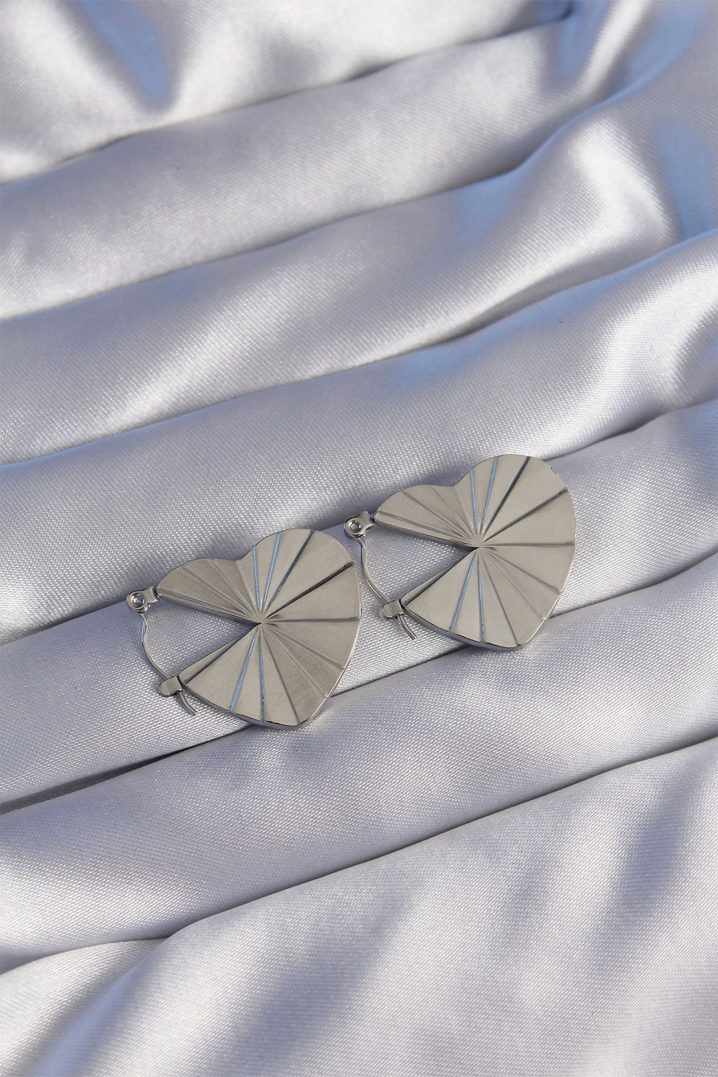 316L Çelik Gümüş Renk Çizgili Plaka Tasarımlı Kalp Küpe