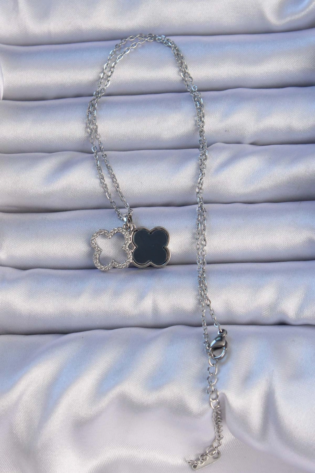 316L Çelik Gümüş Renk Siyah Mineli Zirkon Taşlı Yonca Figürlü Kolye