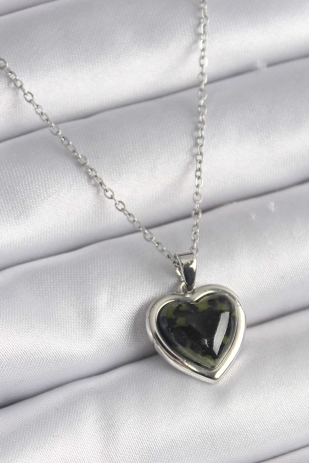 316L Çelik Gümüş Renk Yeşil Mineli Kalp Model Kadın Kolye