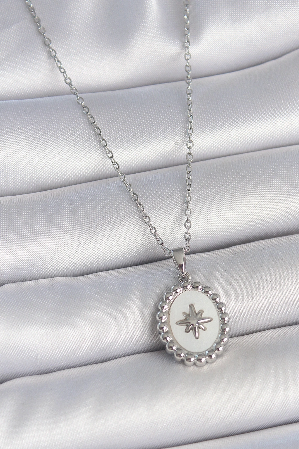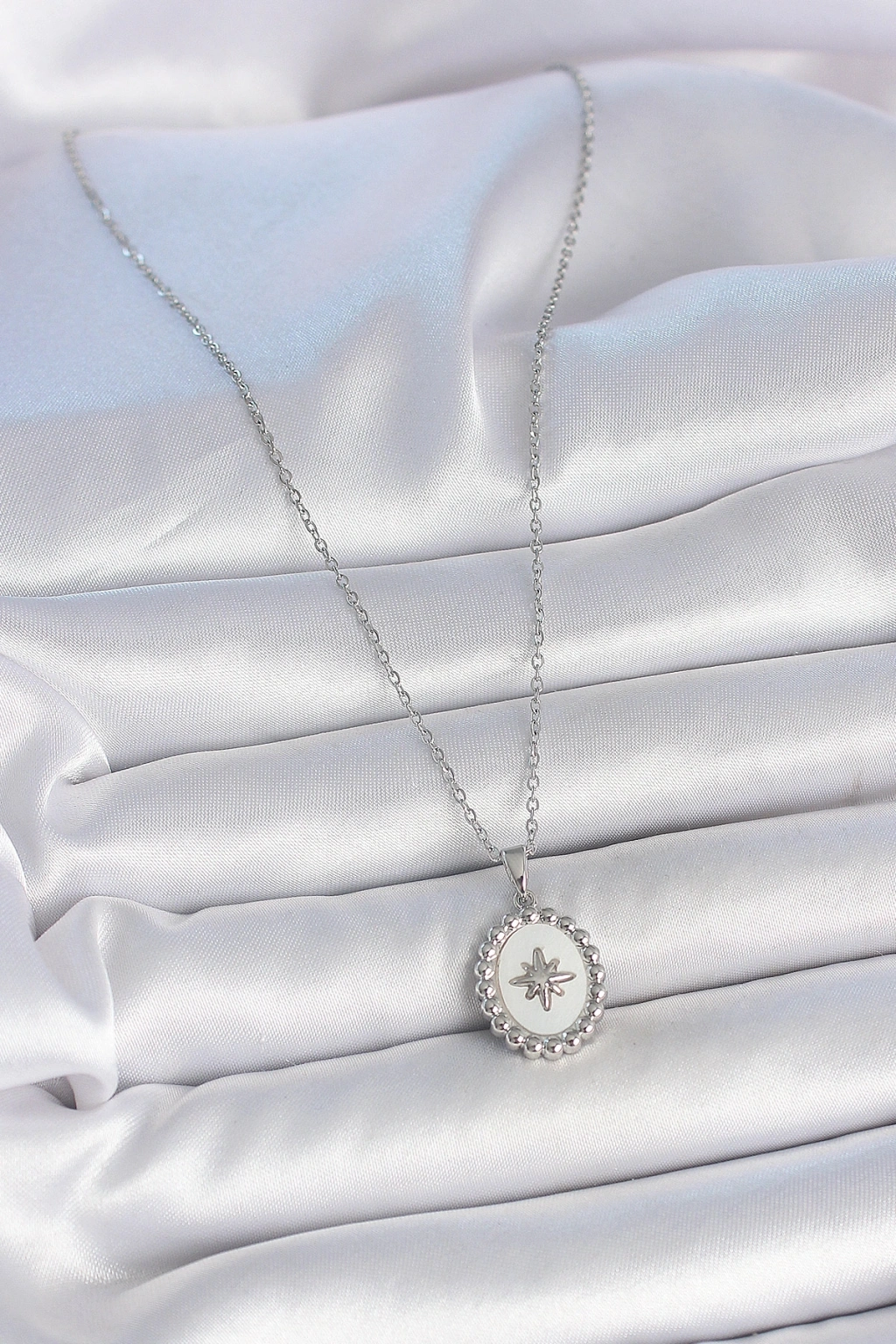 316L Çelik Gümüş Renk Zincir Beyaz Mineli Kutup Yıldız İşlemeli Madalyon Model Kadın Kolye