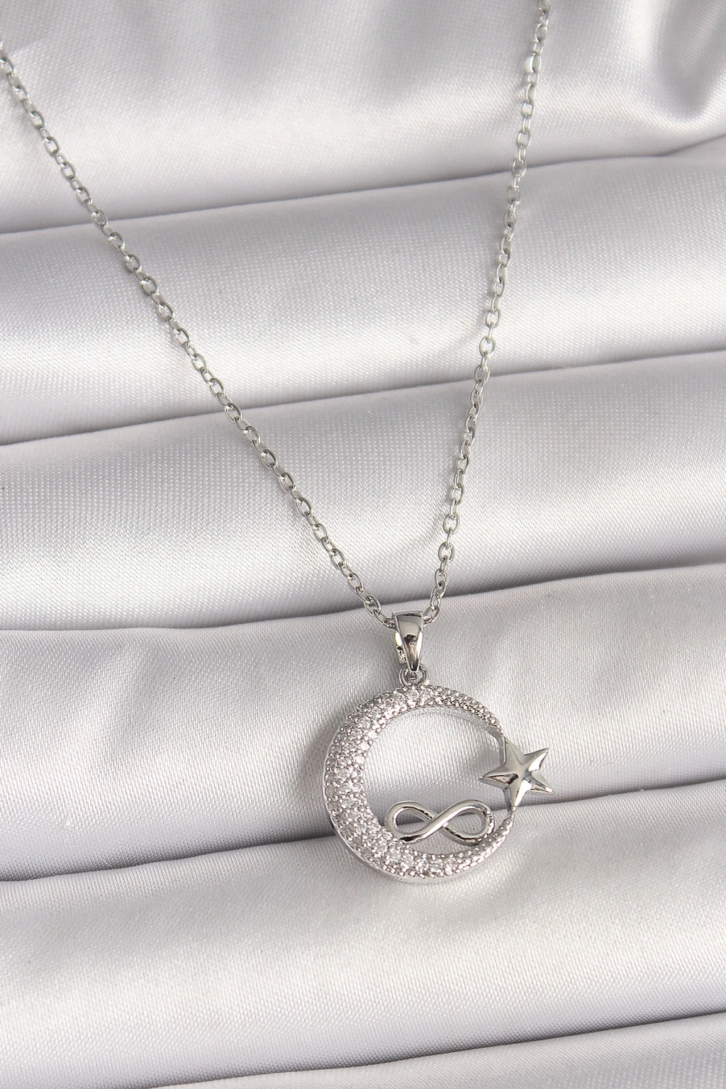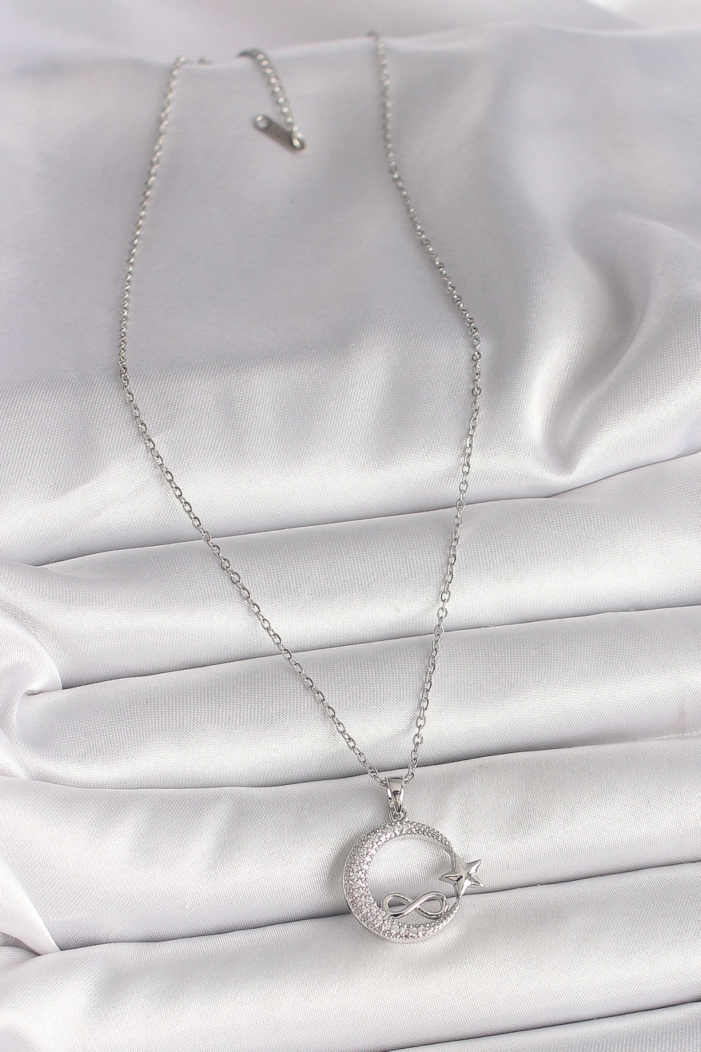 316L Çelik Gümüş Renk Zincir Zirkon Taşlı Ay Yıldız Model Sonsuzluk Detay Kadın Kolye