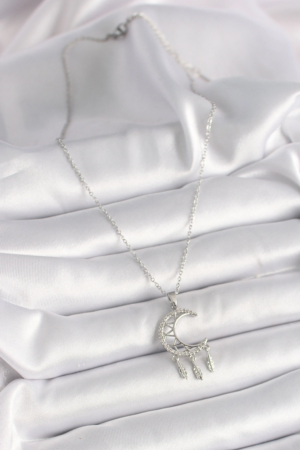 316L Çelik Gümüş Renk Zincir Zirkon Taşlı Hilal Model Sallantı Yaprak Detay Kadın Kolye