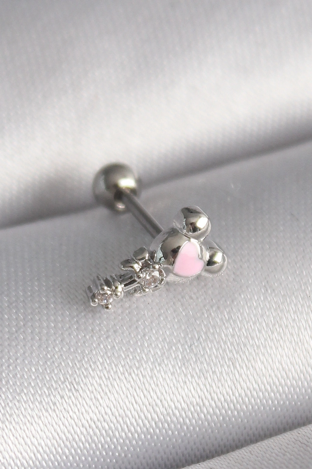 316L Çelik Gümüş Renk Zirkon Taş Detay Pembe Kalp İşleme Tragus Piercing