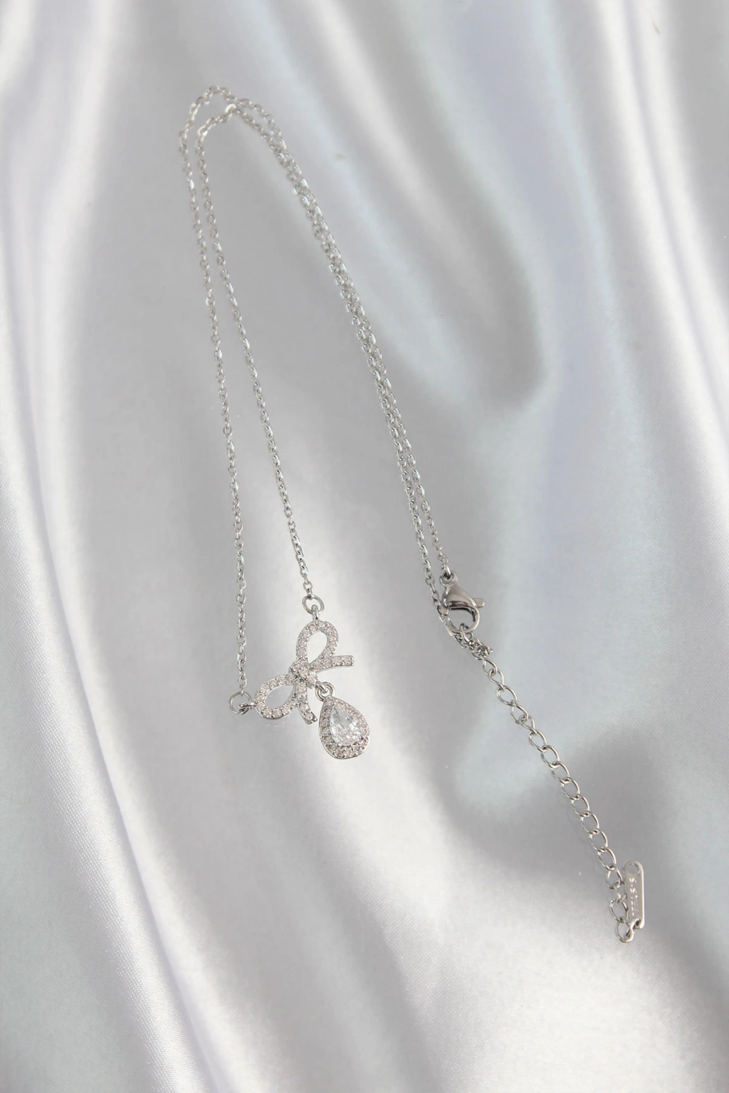316L Çelik Gümüş Renk Zirkon Taşlı Fiyonk Detay Damla Kolye