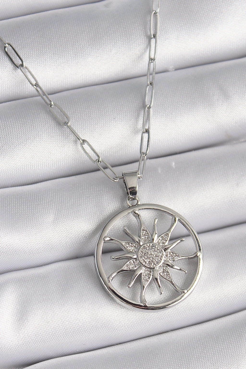 316L Çelik Gümüş Renk Zirkon Taşlı Güneş Madalyon Model Kadın Kolye