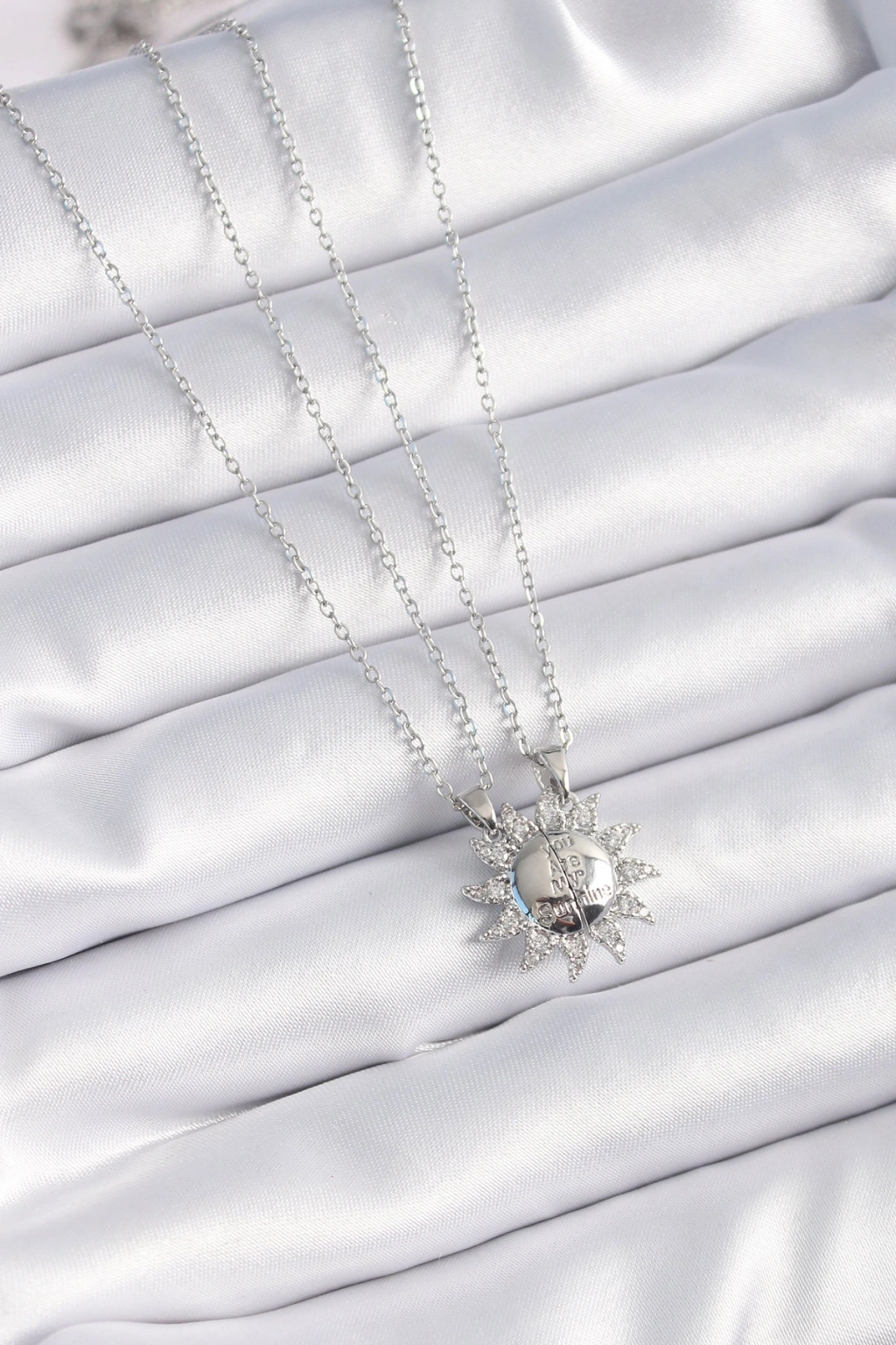 316L Çelik Gümüş Renk Zirkon Taşlı Güneş Model İşleme Yazı Detay Arkadaşlık Kolyesi