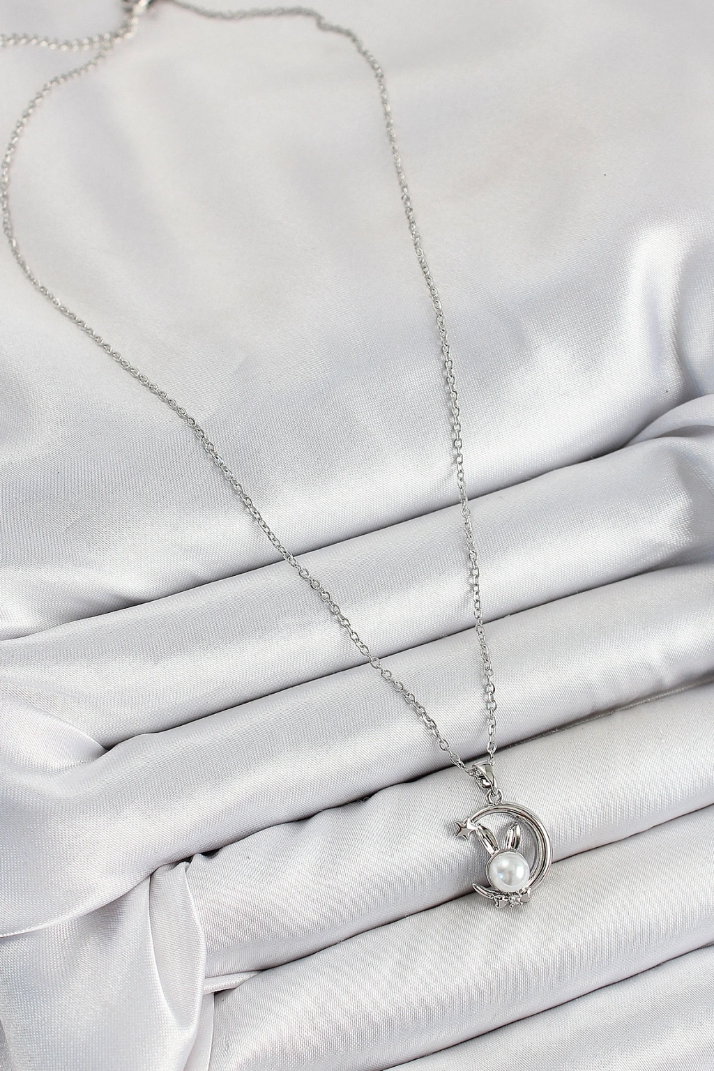 316L Çelik İnci Detaylı Hilal Tavşan Model Gümüş Renk Kadın Kolye