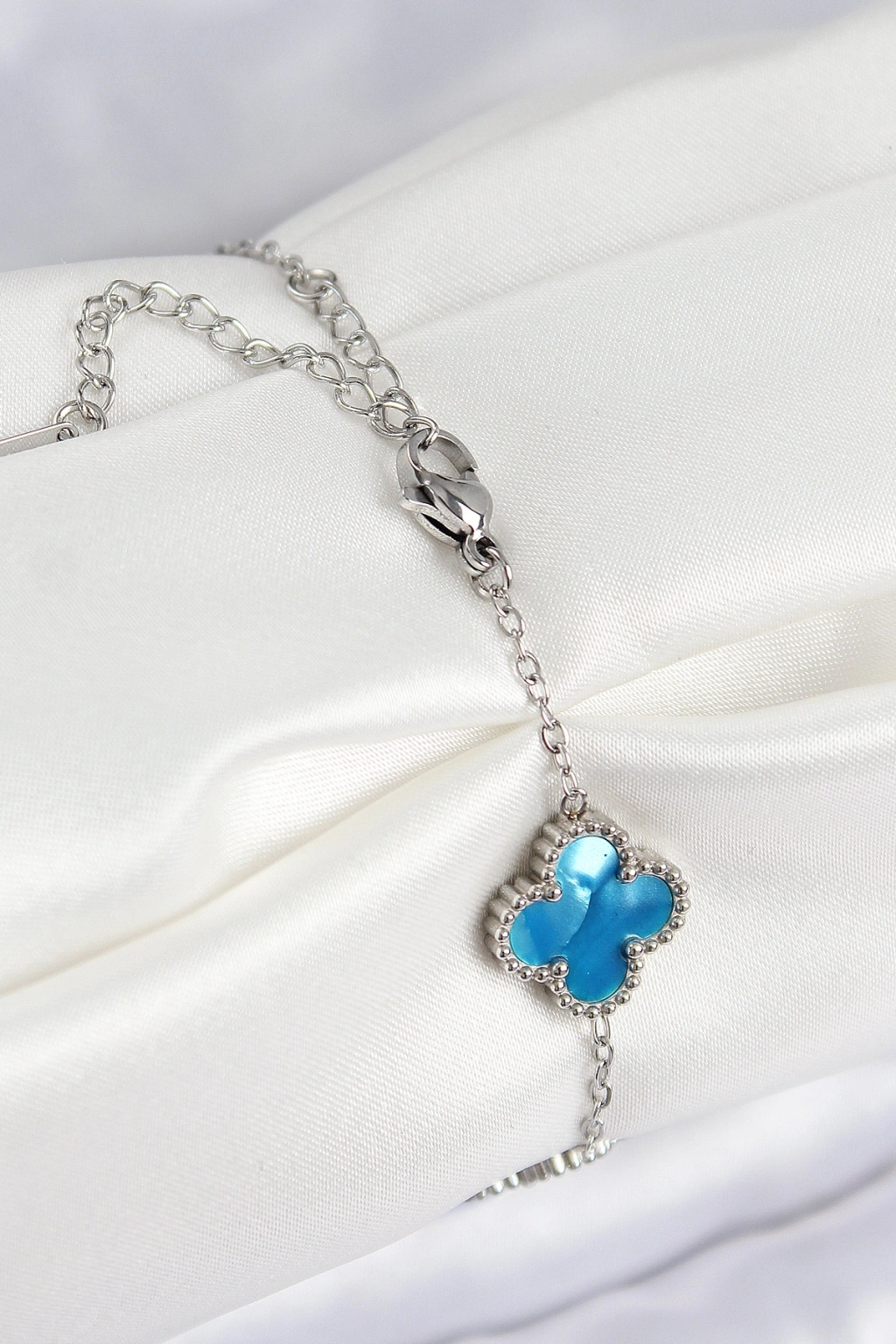 316L Çelik Sedefli Gökyüzü Mavisi Gümüş Renk Yonca Kadın Bileklik