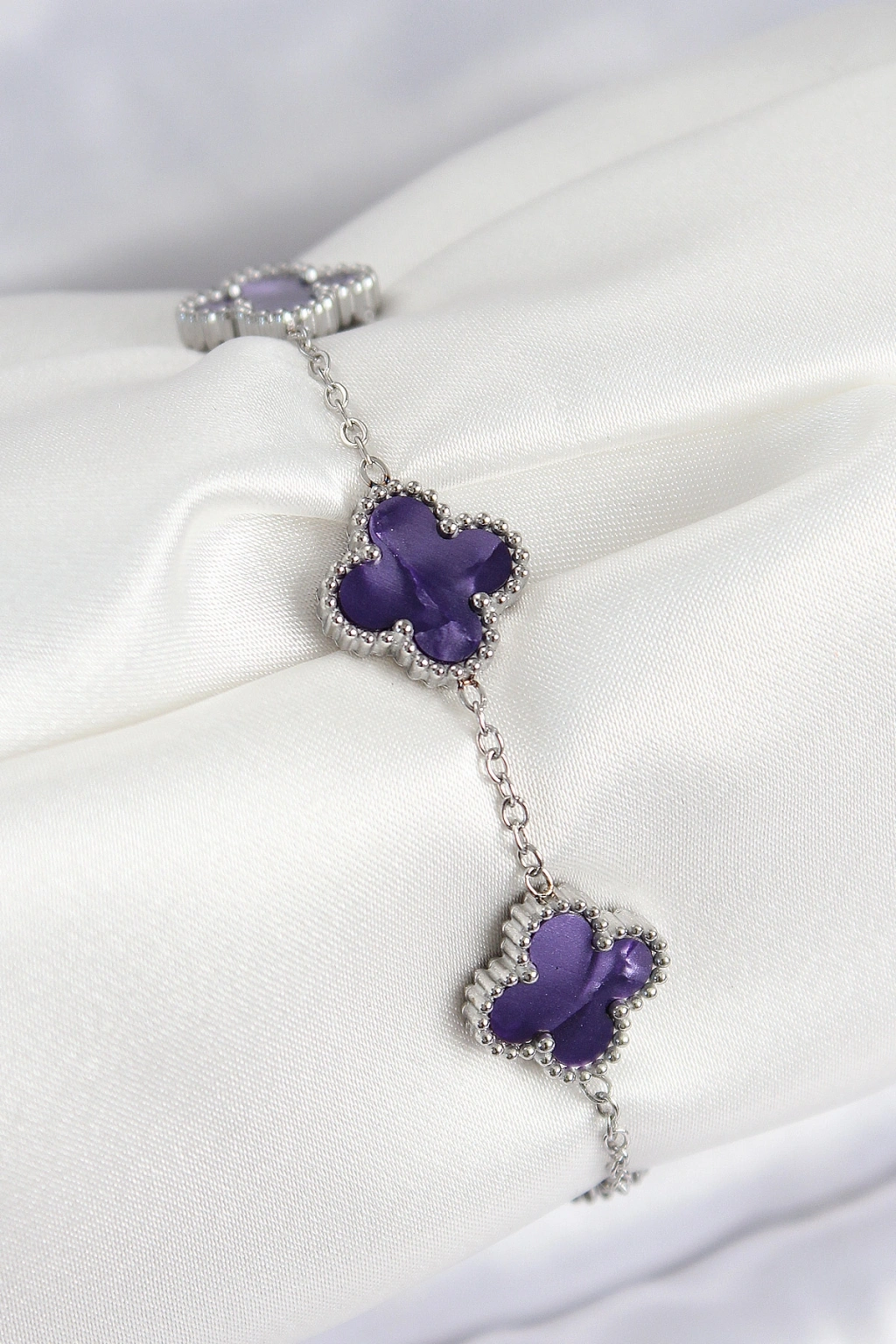 316L Çelik Sedefli Mor Gümüş Renk Yonca Kadın Bileklik