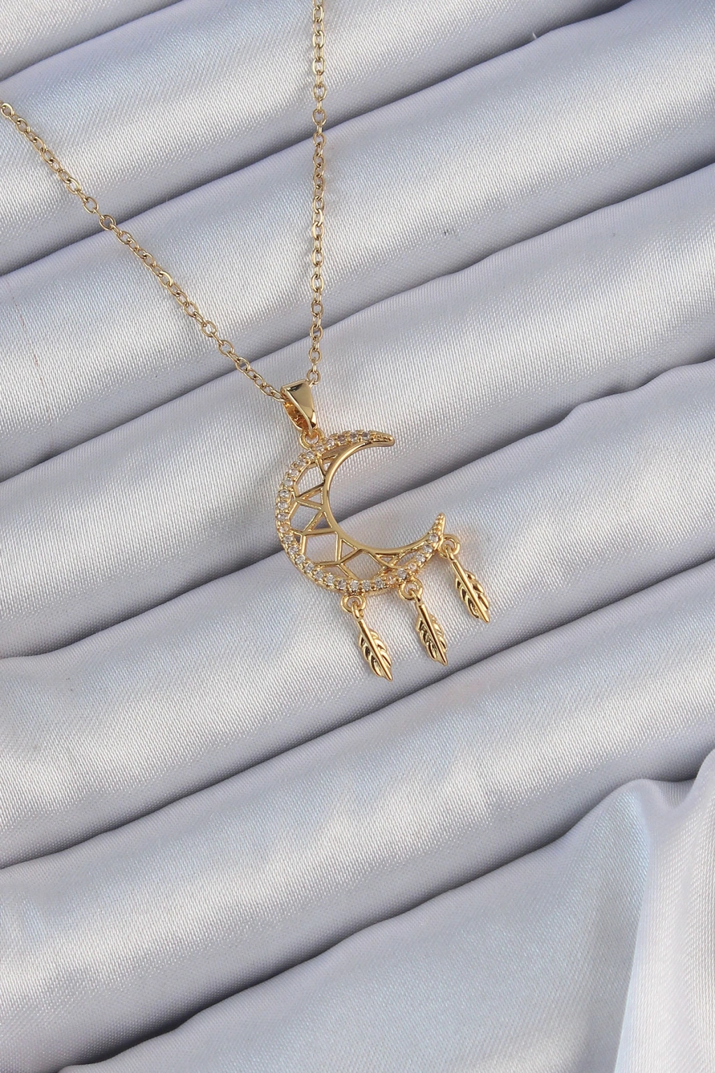 316L Çelik Zincir Altın Renk İşlemeli Zirkon Taşlı Ay Kolye