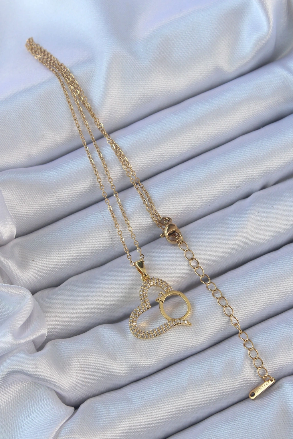 316L Çelik Zincir Altın Renk Zirkon Taşlı Yüzüklü Kalp Kolye
