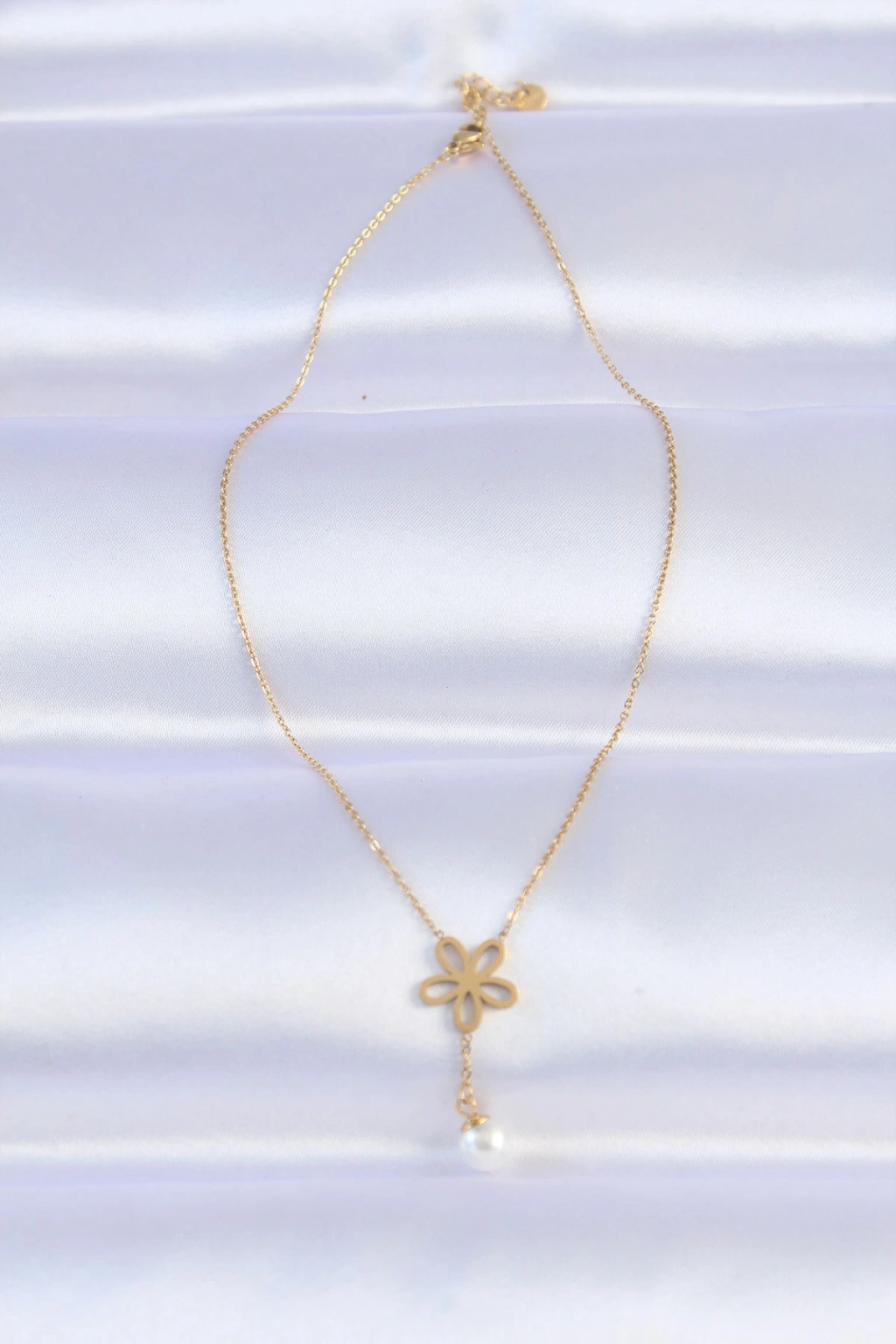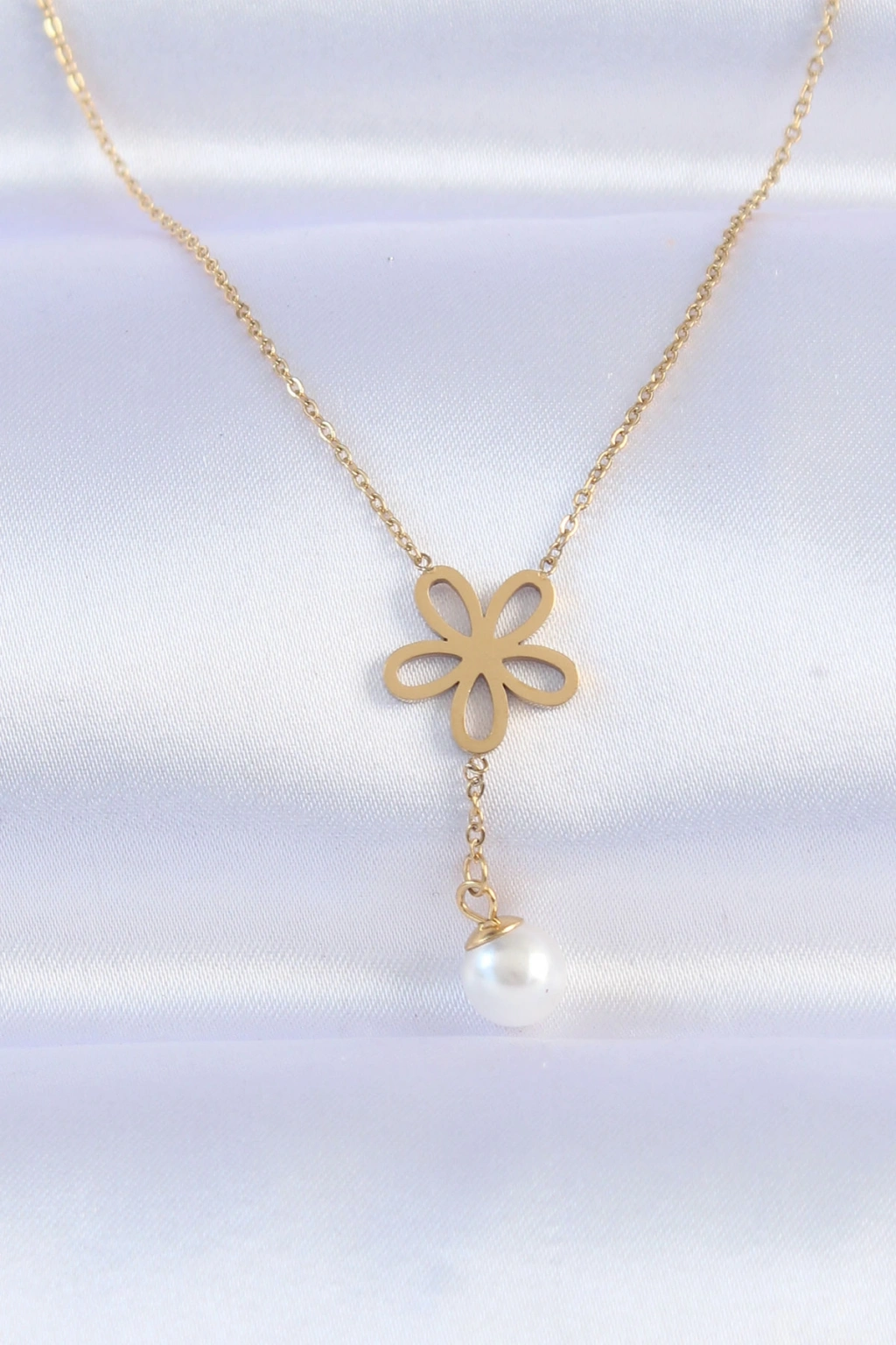 316L Çelik Zincir Gold Renk İnci Detay Çiçek Kolye