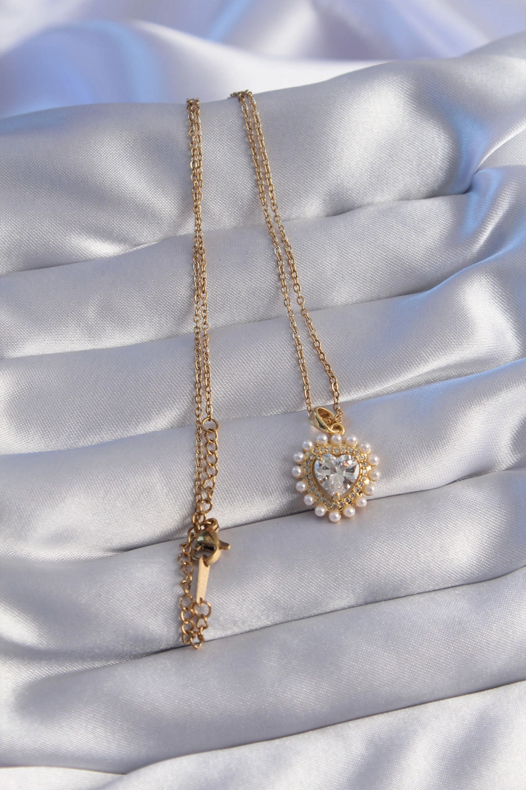 316L Çelik Zincir Gold Renk İncili Zirkon Taşlı Kalp Tasarımlı Kolye