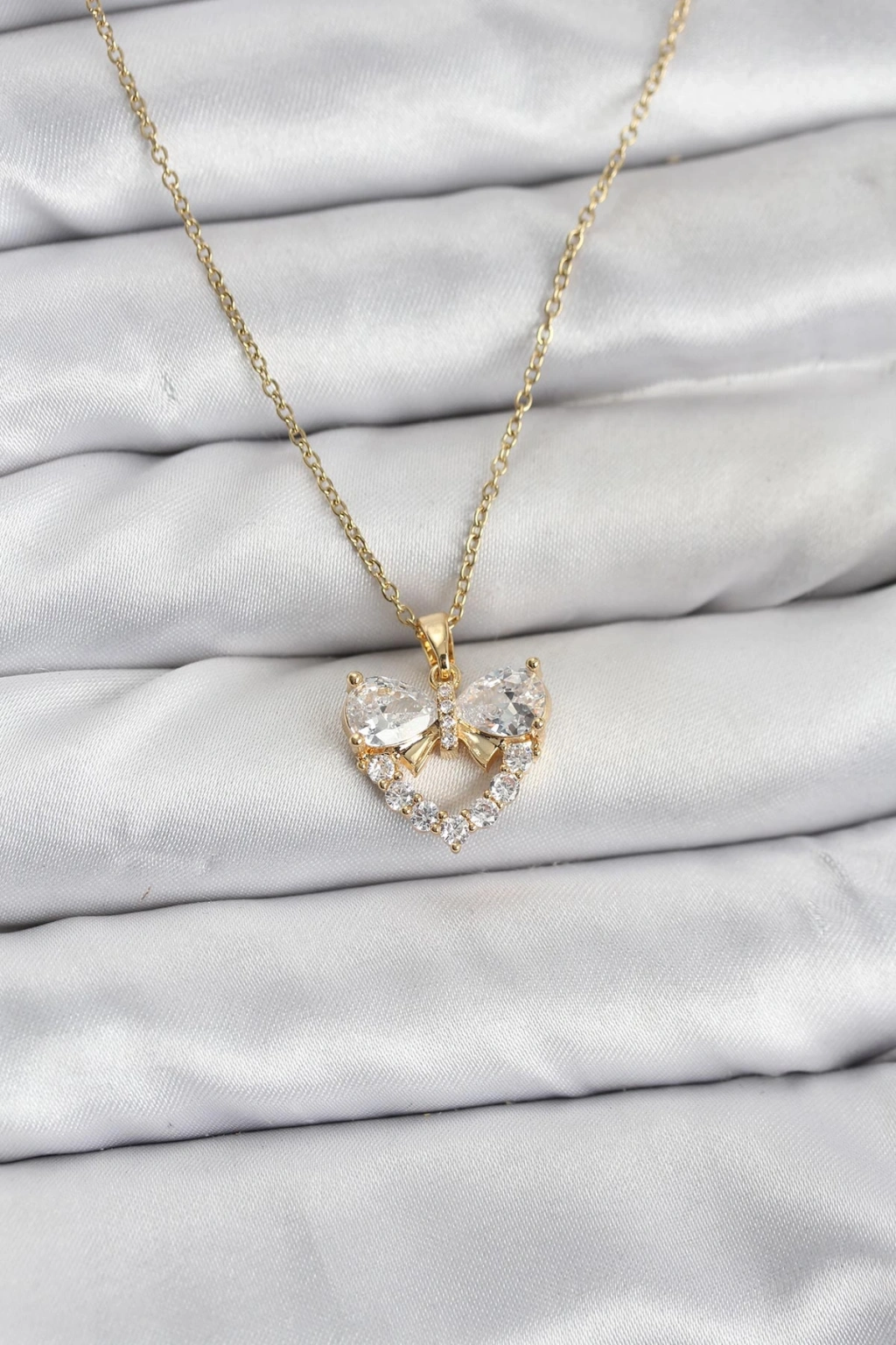 316L Çelik Zincir Gold Renk Kalp ve Fiyonk Model Zirkon Taşlı Kadın Kolye