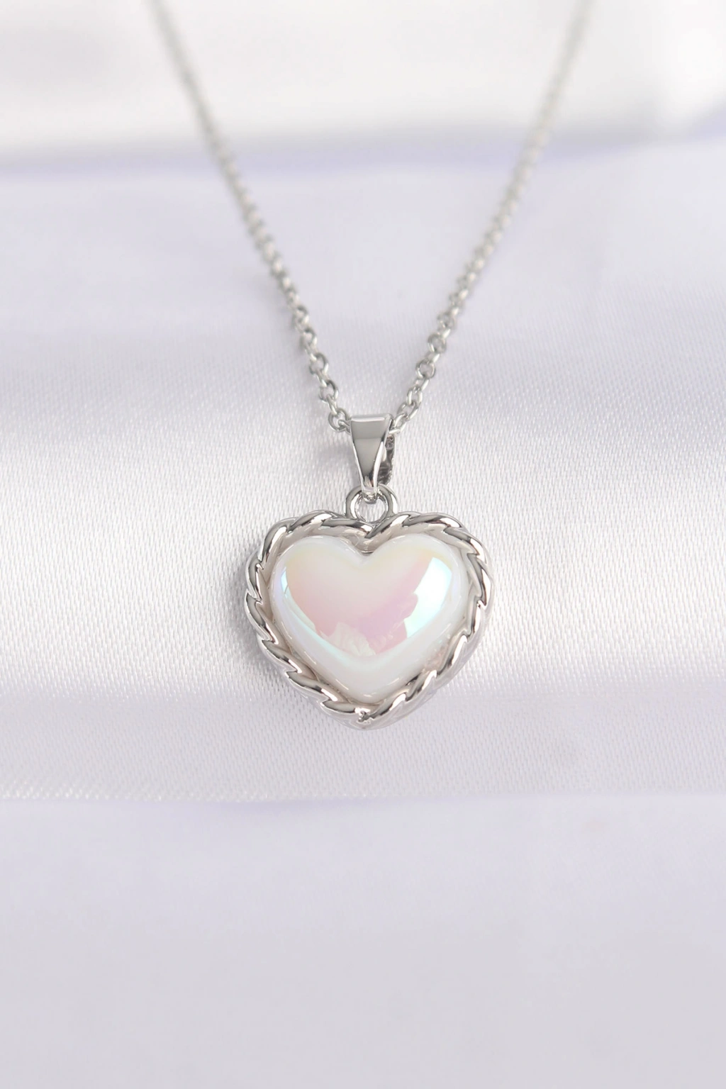 316L Çelik Zincir Gümüş Renk Beyaz Taşlı Bombeli Kalp Kolye