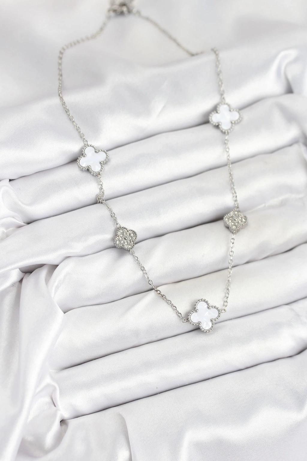 316L Çelik Zincir Gümüş Renk Beyaz ve Zirkon Taşlı Yonca Kadın Kolye
