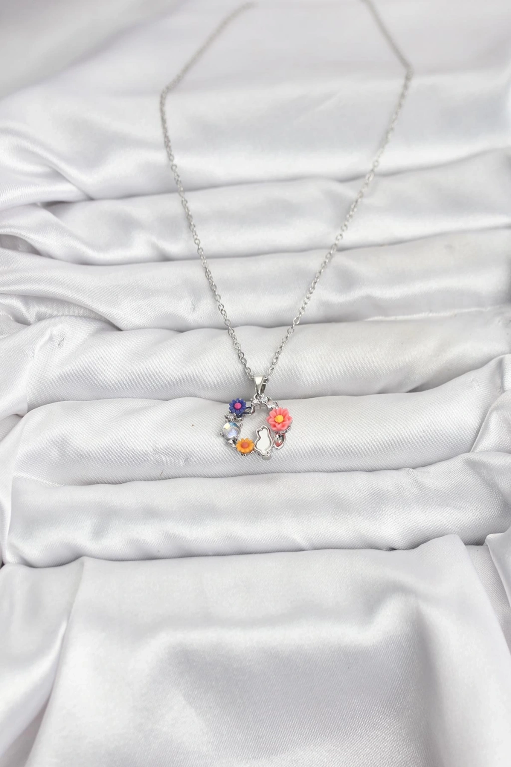 316L Çelik Zincir Gümüş Renk Çiçekli Kedili Model Kadın Kolye