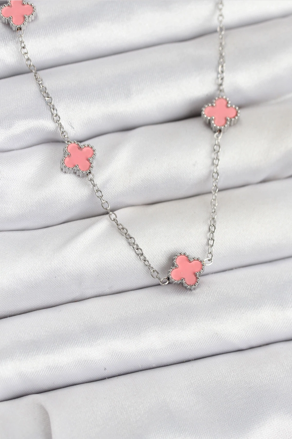 316L Çelik Zincir Gümüş Renk Pembe Baby Boy Yonca Kadın Kolye