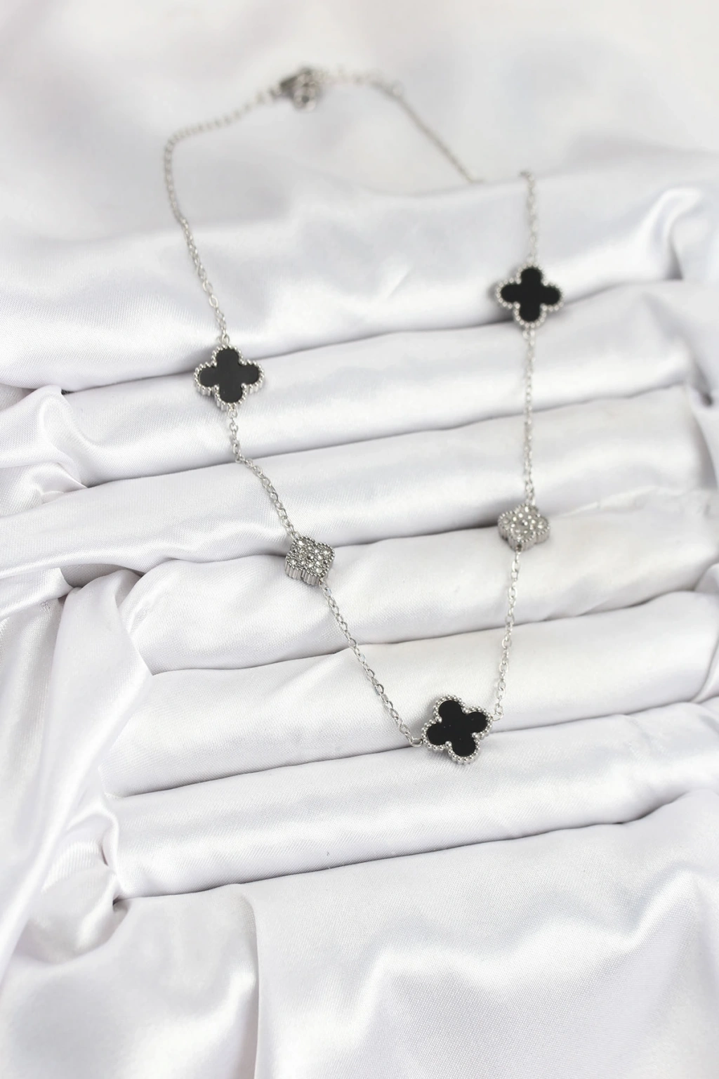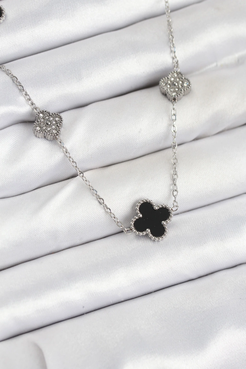316L Çelik Zincir Gümüş Renk Siyah ve Zirkon Taşlı Yonca Kadın Kolye