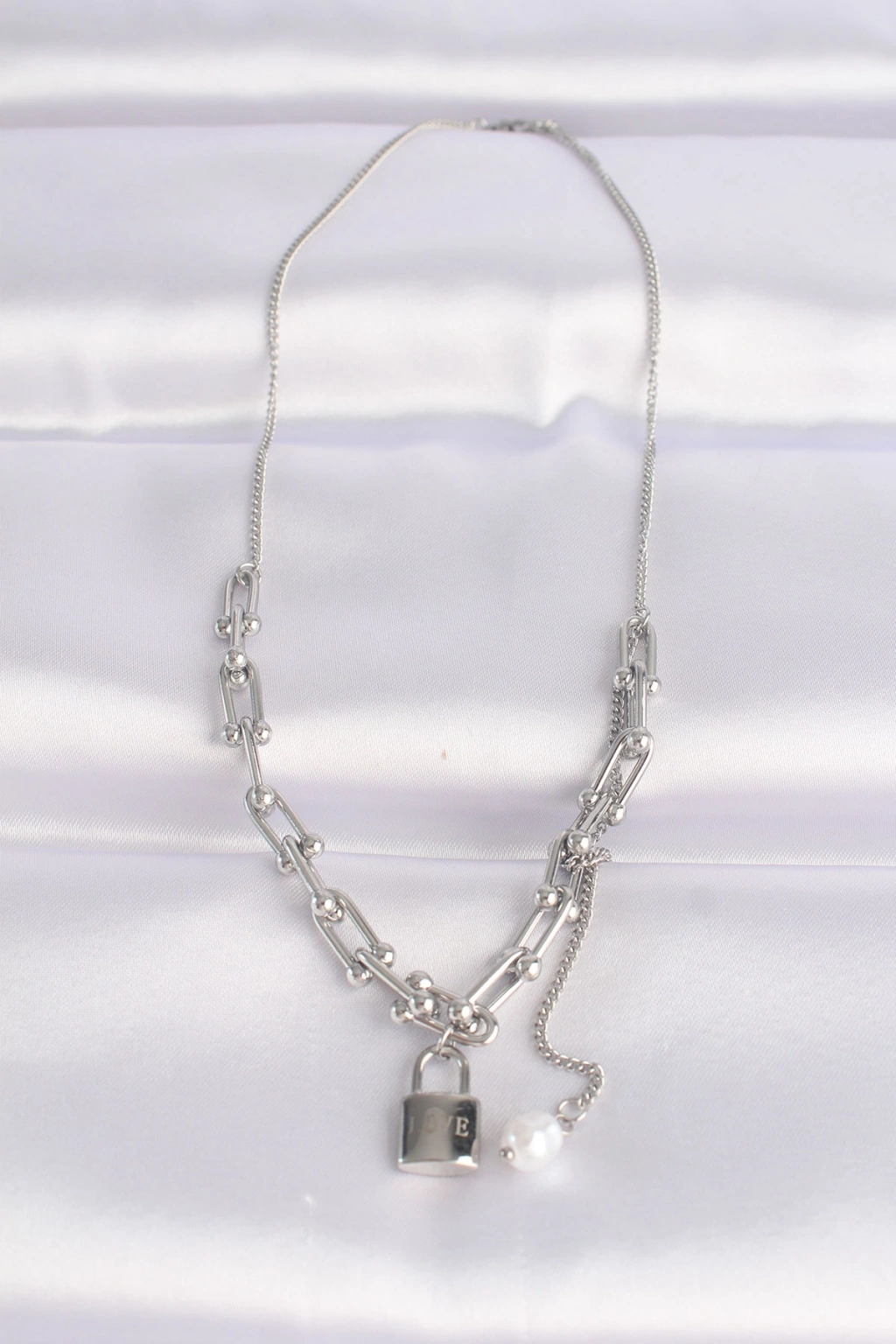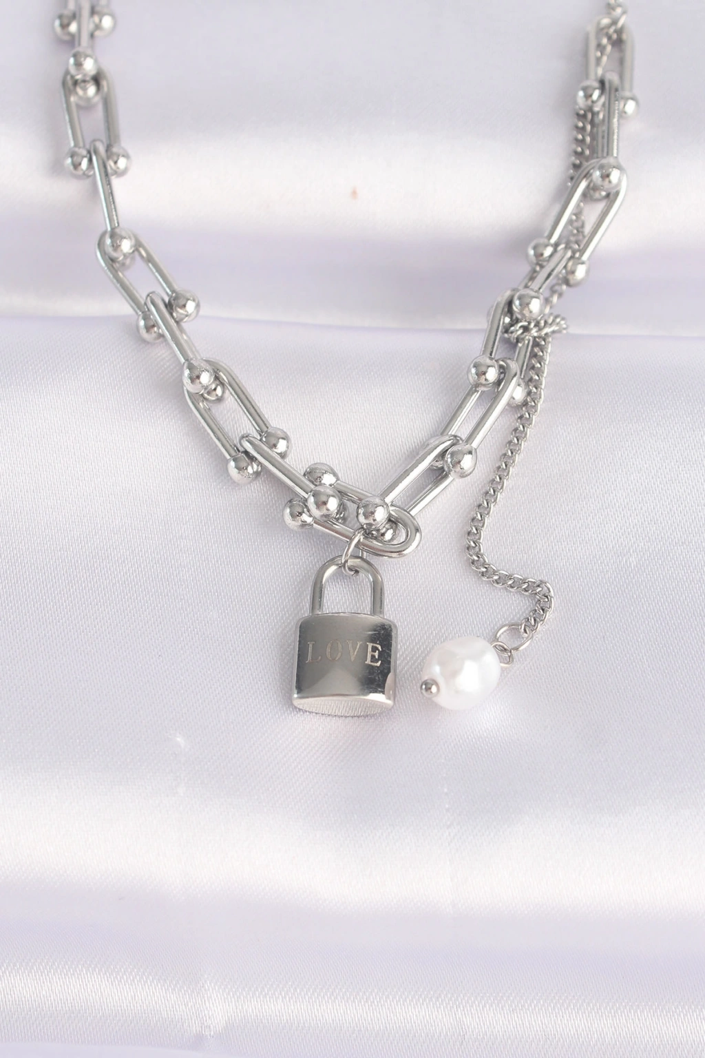 316L Çelik Zincir Gümüş Renk Zincirli Love Yazılı Kilit Kolye