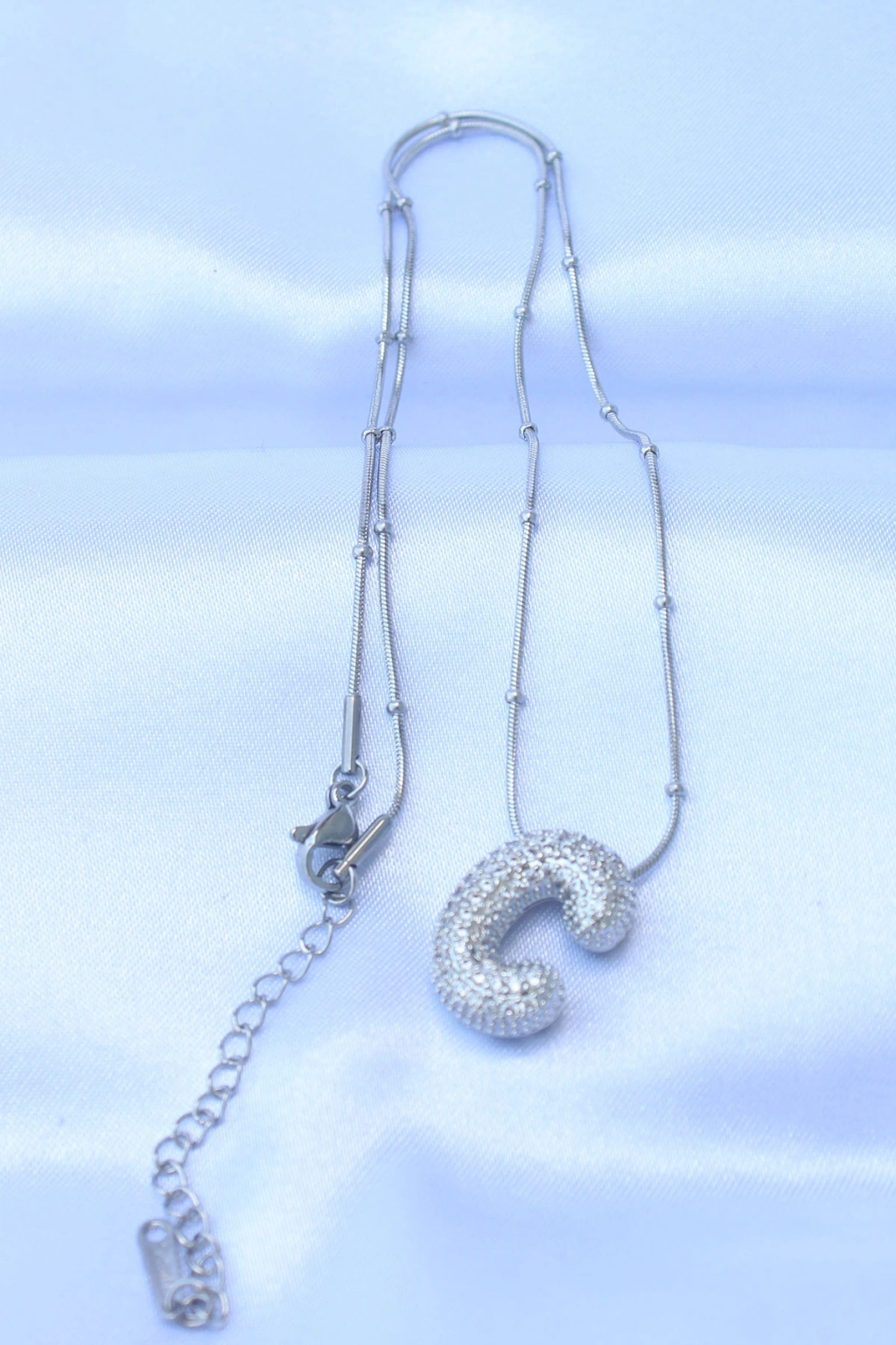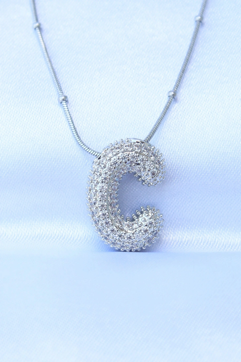 316L Çelik Zincirli Zirkon Taşlı C Harfli Gümüş Renk Bubble Kolye