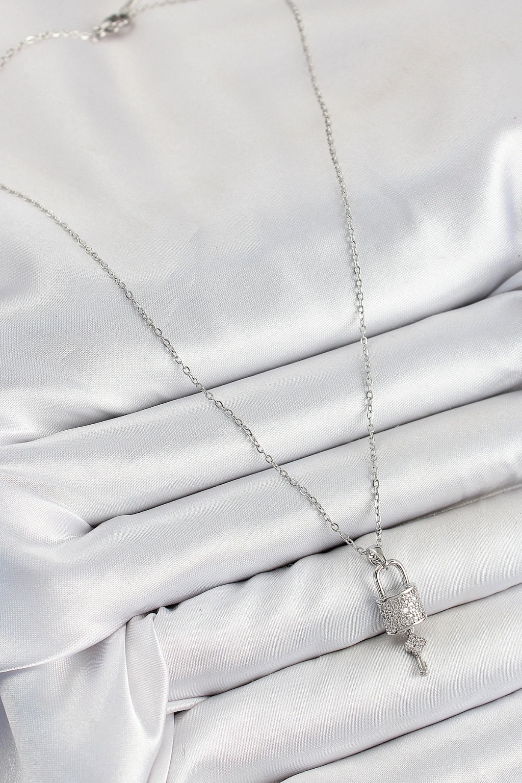 316L Çelik Zirkon Taşlı Kilit Ve Sallantılı Anahtar Model Gümüş Renk Kadın Kolye