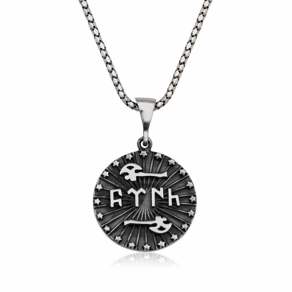 İlk zamanların en eski Tanrısı Ares-Dionisos yeryüzüne çıkar. Henüz hiç bir şey yaratılmamıştır, hiç bir şey biçimlenmemiştir, sadece karanlık vardır. Ama göklerden Ares- Dionisos’a bir silah bahşedilir, bu Labris’dir ve onunla dünyayı dövmesi gerektiğinden bahsedilir. Bu karanlıkların ortasında Ares-Dionisos etrafta yürümeye başlar. Şu bağlamda bu tuhaftır; güncel bilimin de keşfettiği gibi, karanlıkta kalındığında ve hangi yerde bulunulduğu bilinmediği zaman, ya da büyük bir yere çıkılmak istendiği zaman, ilk önce etrafta yürüme eğilimi gösterilir; tıpkı kaybolunduğunda yapıldığı gibi.Bu bağlamayı yapıyoruz çünkü başından beri, insanlar var olduğundan beridir bugün bile hala koruduğumuz aforizmalarla labirentin anlamı arasında bir bağ kurmak istiyoruz. İşte; Ares-Dionisos etrafta baltası ile beraber yürümeye başlar. Karanlığı keser ve bir saban izi bırakır. Onun açtığı bu yol azar azar aydınlanmaya başlar, bu labirent olarak adlandırılır, yani Labris ile açılmış (biçilmiş) patika. Ares- Dionisos kesme sayesinde kendi patikasının merkezine vardığı zaman, fark eder ki ilk başta elinde tuttuğu balta artık yoktur. Şimdi ellerinin arasında tuttuğu Baltası saf ışık olmuştur, bir sevinç ateşi, bir alev, kusursuzca yanan bir meşale haline gelmiştir, çünkü iki mucize gerçekleşir: Baltanın bir tarafıyla dışarıda olan karanlığı kesmiştir ve diğer tarafı ile kendi öz karanlığını kesmiştir. Dışarıya ışık yaptığı gibi, kendi içine de ışık yapmıştır, dışarıya doğru bir geçiş açtığı gibi kendi içine doğru da açmıştır. Böylece labirentin merkezine geldiğinde, yolun merkezini bulur: O ışığa ulaşmış ve kendine varmıştır. Bu Girit’te labirent mitosu hakkında bulunabilecek en eski gelenektir. Sizde gümüş baltalı türk yazılı kolye severek kullanabilir sevdiklerinize armağan edebilirsiniz..Gümüş kolye Göktürk Alfabesi ile 'Türk' yazısı yer almaktadır. Ürünlerimizin tamamı el emeği ile üretilmiştir. Gümüş ve değerli taşlar nedeniyle ürün ağırlığında ± %10 sapma olabilmektedir.