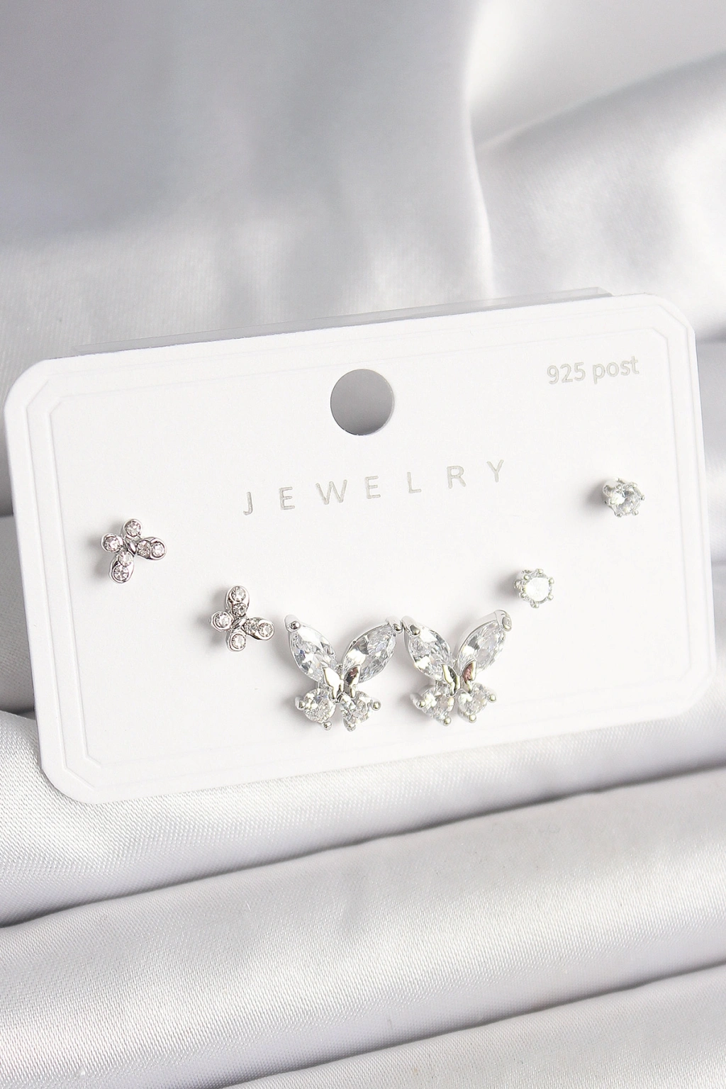 925 Ayar Gümüş Çivi Pirinç Zirkon Taşlı Kelebek Model Kadın Küpe Seti