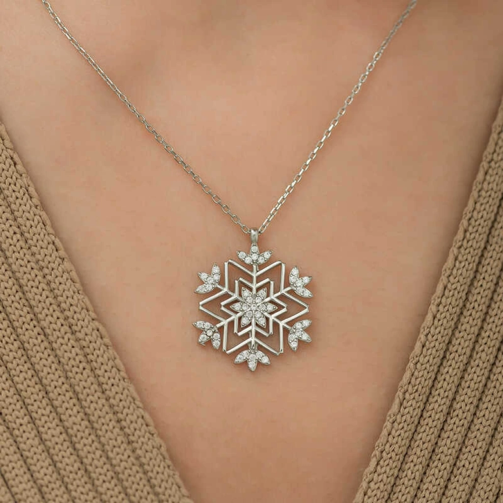 Kadınların ışıltısı, berraklığı kar tanesine benzetilip özel olarak tasarlanmıştır. Kar tanelerinin her birinin kadınlar gibi eşsiz ve ayrı kıymette olması onları özel kılan bir diğer özelliktir. Asilliği her dönemde dikkat çekmeyi başarmıştır. Bunun yanında insanların tıpkı kar taneleri gibi birbirlerine zarar vermeden de mutlu bir şekilde yaşayabileceklerini sembolize etmektedir. Bu şık kolye; doğum günü hediyesi, sevgililer günü hediyesi veya annelere hediye olarak özel günlerde tercih edilebilecek mükemmel bir seçenektir. Kolye, 925 ayar gümüşten imal edilmiştir. Gümüş üzerine rodyum kaplama yapılmıştır. Rodyum kaplama yapılan ürünler parlaklığını uzun süre muhafaza eder ve oksitlenmesi gecikir. Tüm gümüş kolyelerde olduğu gibi bu gümüş kar tanesi kolye de tamamı el emeği ile üretilmiştir. Gümüş ve değerli taşlar nedeniyle belirtilen ortalama ürün ağırlığında ± %10 sapma olabilmektedir.