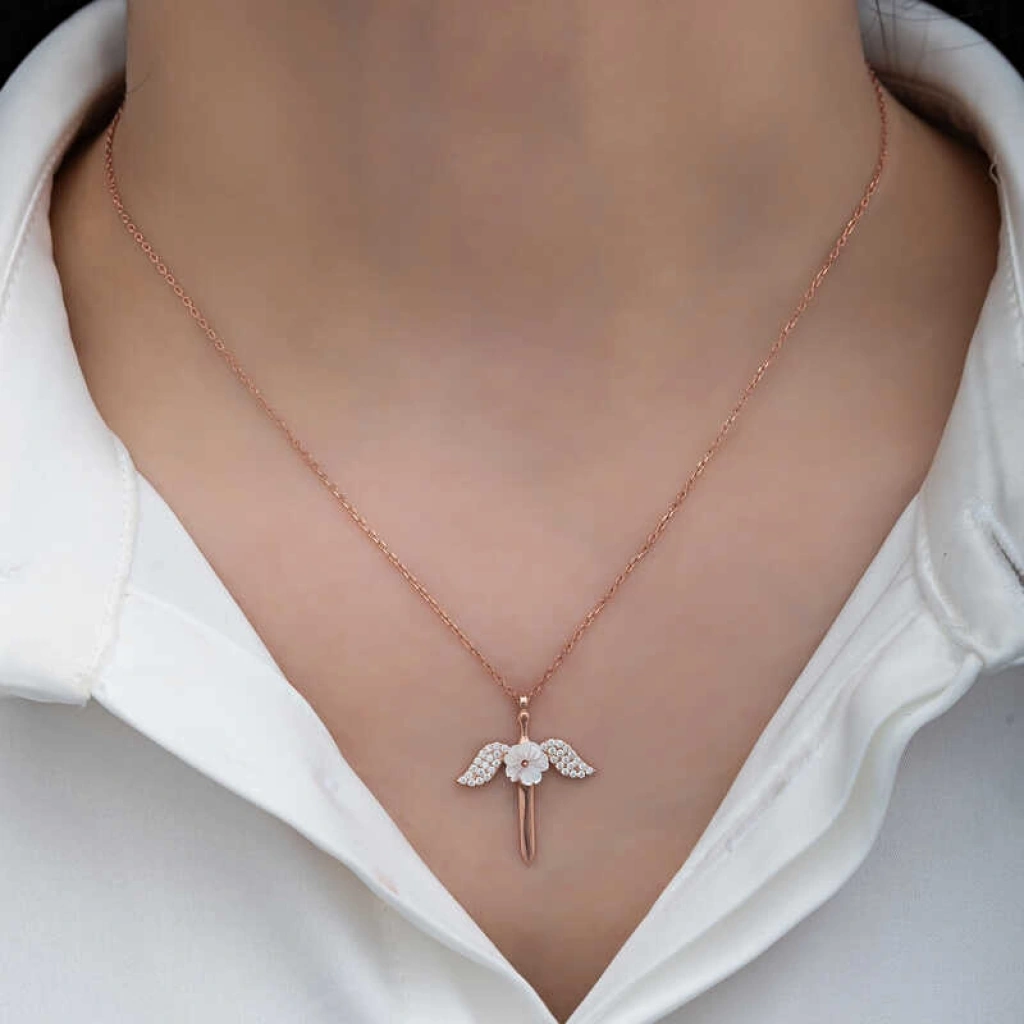 Melekler saflığın ve temizliğin simgeleridir. Bu nedenle melek kolye hediye edilen kişiye melek kadar saf ve temiz olduğu mesajı verilmektedir... Aşkınızı meleklerin koruması için tasarlanan bu özel manolya çiçeği melek kadın kolyeyi sevgilinize; doğum günü, sevgililer günü ve özel günlerde hediye ederek onları mutlu edebilirsiniz. Kolye; 925 ayar gümüşten imal edilmiştir. Gümüş melek kadın kolye üzerine rodyum kaplama yapılmıştır. Rodyum kaplama yapılan tüm kolyeler parlaklığını uzun süre muhafaza eder, gümüşe pembe rengi verir. Tüm gümüş kolyelerde olduğu gibi bu gümüş manolya çiçeği melek kadın kolye de el emeği ile üretilmiştir. Gümüş ve değerli taşlar nedeniyle ürün ağırlığında ± %10 sapma olabilmektedir.
