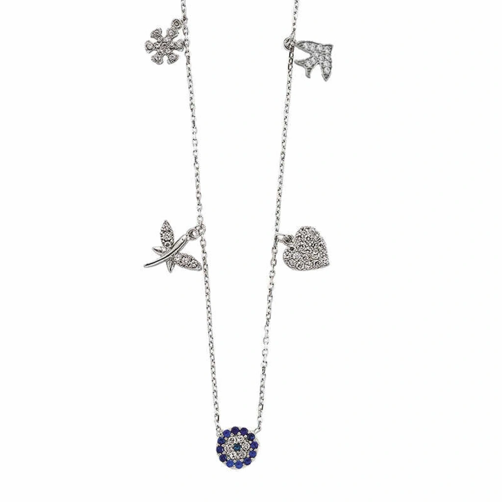 Sevdiklerinize şans getirmesi için alabileceğiniz en şık modellerden biri gümüş şans kolyesidir. Sade tasarımıyla günlük hayatta rahatlıkla kullanabileceğiniz bu model 925 ayar gümüşten imal edilmiştir. Gümüş üzerine rodyum kaplama yapılmıştır. Rodyum kaplama yapılan gümüş şans kolye modelleri parlaklığını uzun süre muhafaza eder ve oksitlenmesi gecikir. Kolye üzerinde bulunan tüm taşlar zirkondur. Gümüş olan zincir boyu ortalama 45 cm'dir. Tüm gümüş kolye modellerinde olduğu gibi gümüş şans kolye modeli de el emeği ile üretilmiştir. Gümüş ve değerli taşlar nedeniyle belirtilen ortalama ürün ağırlığında ± %10 sapma olabilmektedir.