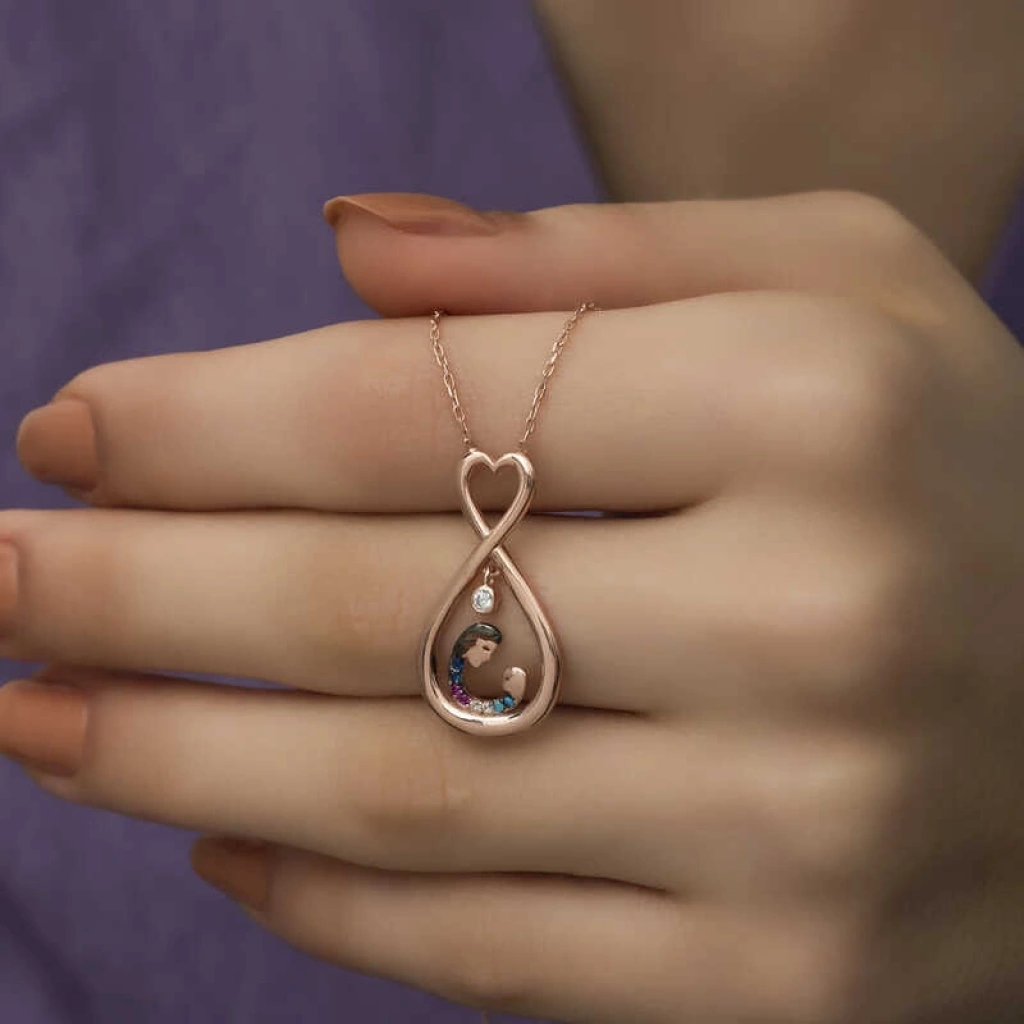 Çocuk ve anne arasındaki sevgiyi temsil eden özel bir tasarımdır. Annenize olan bağlılığınızı belirtmek için alabileceğiniz en uygun hediyelerden biri bu anne çocuk sevgisi kolye olacaktır. Anneniz için tasarlanan bu özel tasarım kalpli anne çocuk kolyesi 925 ayar gümüşten imal edilmiştir. Gümüş üzerine rose kaplama yapılmıştır. Rose kaplama yapılan gümüş anne çocuk kolye modelleri parlaklığını uzun süre muhafaza eder ve oksitlenmesi gecikir. Kolye üzerinde bulunan taşlar zirkondur. Gümüş olan zincir boyu ortalama 45 cm'dir. Gümüş sonsuz kalpli anne çocuk kolyesi el emeği ile üretilmiştir. Gümüş ve değerli taşlar nedeniyle belirtilen ortalama ürün ağırlığında ± %10 sapma olabilmektedir.