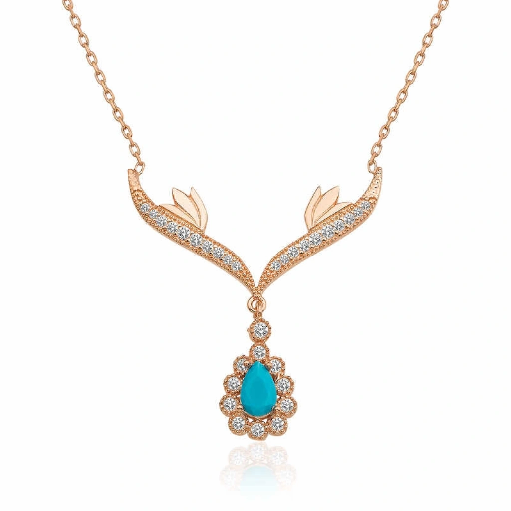 Turkuaz damla taşlı madalyon kolye her sezon rahatlıkla kullanılabilecek kolye modelleri arasında yer alıyor. Doğadan ilham aınarak tasarlanmış bu kolye ile sevdiğiniz kadına duyduğunuz aşkı ve tutkuyu en iyi şekilde ifade edebilirsiniz. Bu şık kolye; doğum günü hediyesi, sevgililer günü veya özel günlerde tercih edilebilecek mükemmel bir seçenektir. Kolye; 925 ayar gümüşten imal edilmiştir. Gümüş üzerine rose kaplama yapılmıştır. Diğer kolyelerde olduğu gibi gümüş turkuaz taşlı madalyon kolye de el emeği ile üretilmiştir. Gümüş ve değerli taşlar nedeniyle belirtilen ortalama ürün ağırlığında ± %10 sapma olabilmektedir.