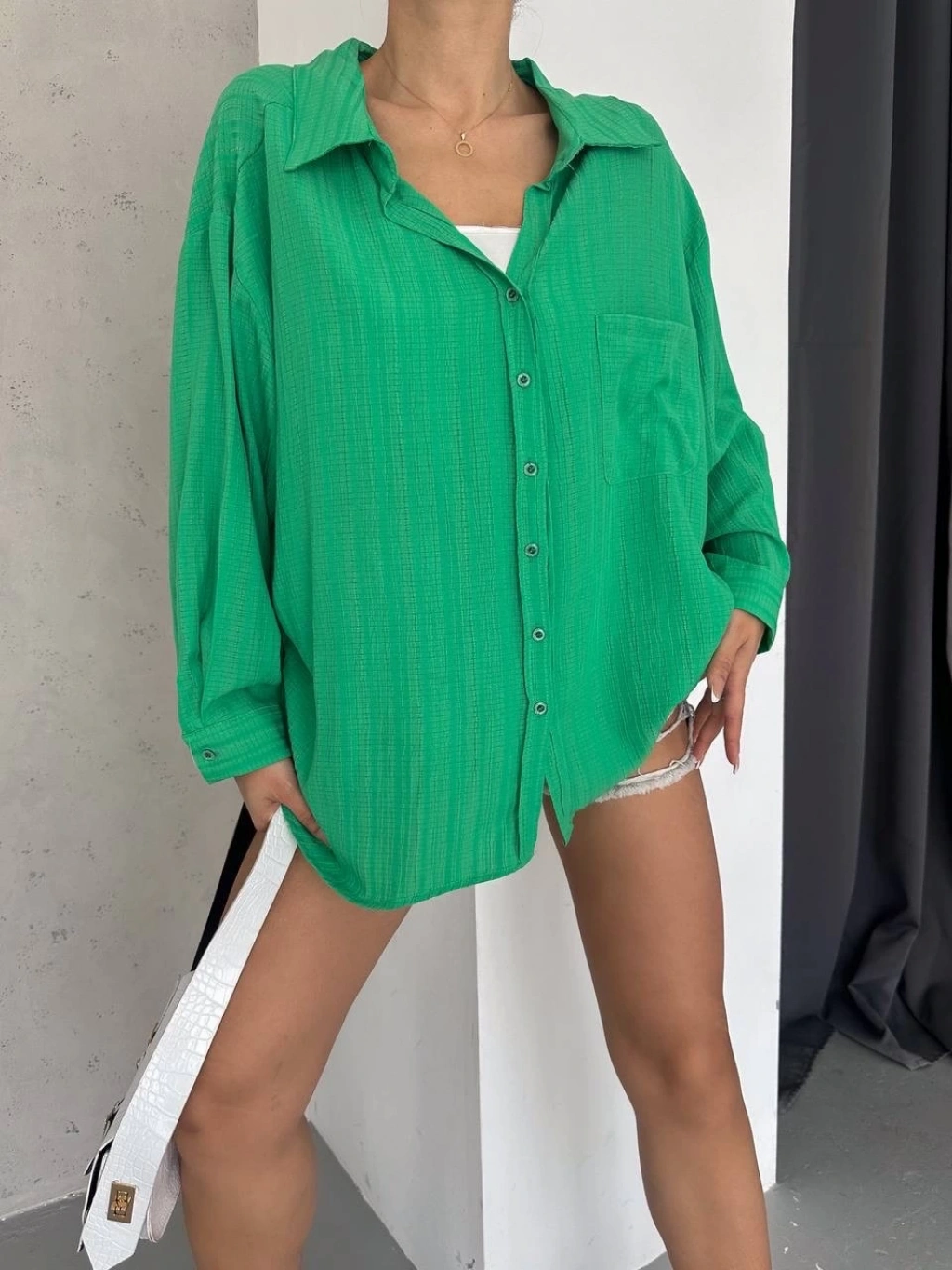 Ağaç Kabuğu Oversize Arkası Pileli Gömlek, rahat ve şık bir görünüm sunar.-- marka ağaç kabuğu desenli oversize gömlek, şıklık ve rahatlığı bir arada sunuyor. - Arkası pileli tasarımıyla hareketlilik katıyor. - V yakalı ve uzun kollu modeliyle modern bir görünüm sağlıyor. - Rahat kesimi sayesinde günlük kullanıma uygun bir seçenek sunuyor. - Kumaş yapısıyla cildi tahriş etmeyen ve konforlu bir deneyim sunan bir üründür. - Farklı beden seçenekleriyle her vücut tipine uyum sağlayacak şekilde üretilmiştir. - Tarzınıza ve kombinlerinize kolaylıkla uyum sağlayacak şık ağaç kabuğu deseniyle dikkat çekici bir parçadır.