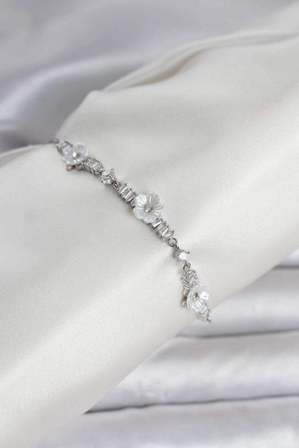 Baget Zirkon Taşlı Çiçek Model Gümüş Renk Asansörlü Kadın Bileklik