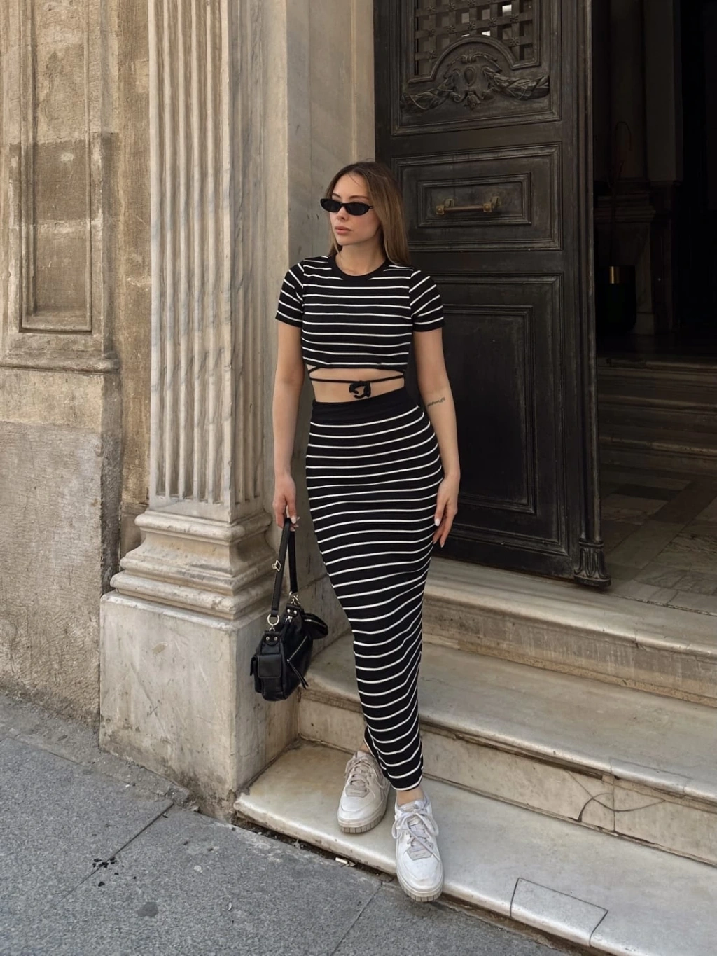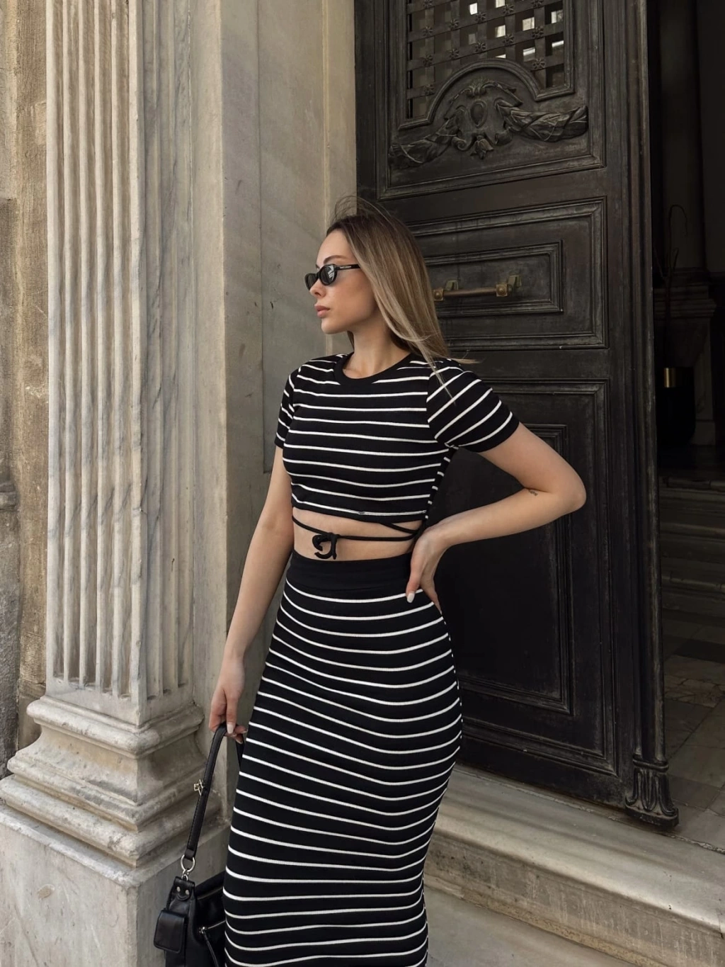 Çizgili etekli takım siyah s3609--Bu siyah çizgili etekli takım, şıklık ve rahatlığı bir arada sunuyor. Hem günlük kullanıma hem de özel davetlere uygun olan bu takım, gardırobunuzun vazgeçilmezi olmaya aday. Ürün Özellikleri: Renk: Siyah Desen: Çizgili Kumaş Türü: Pamuklu Yaka: V yaka Kol Tipi: Uzun kollu